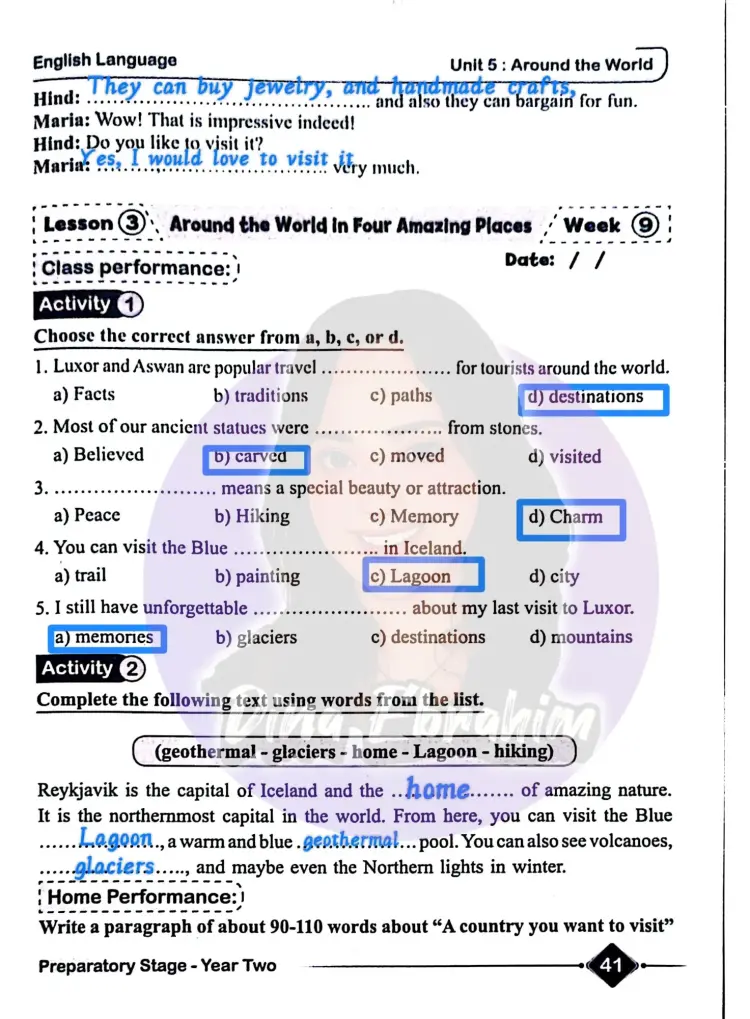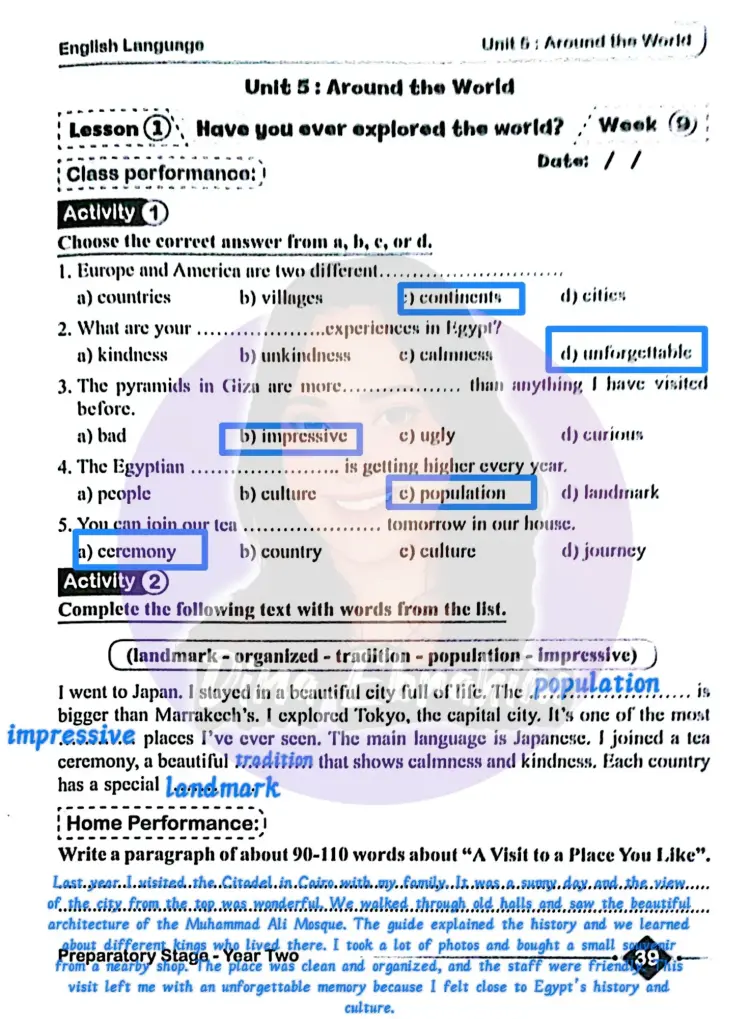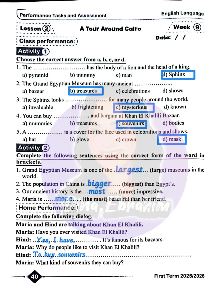 حل الأداء الصفي وواجب وتقييم الأسبوع التاسع إنجليزي للصف الثاني الإعدادي ترم أول 2026