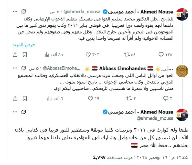 وجاء إعلان موسى عبر منشور على حسابه الرسمي بمنصة «إكس» اليوم الأحد، ليعيد الجدل حول توصيف أحداث 2011، التي يصر موسى على وصفها بـ«الفوضى» و«المؤامرة».