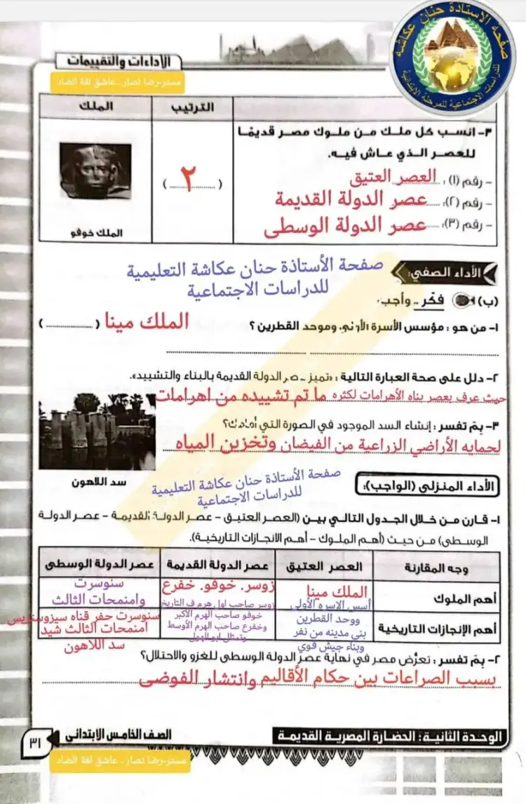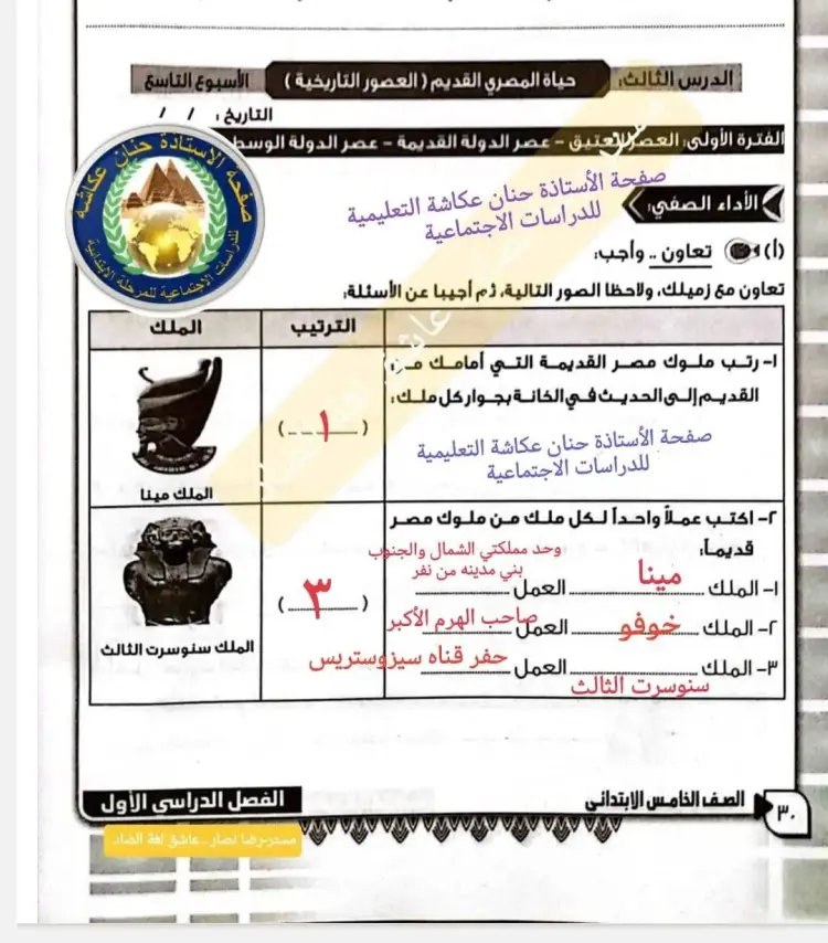 السؤال ١ (ب) - اختر: يُعد صاحب أول هرم في التاريخ هو الملك... الخيارات: (خوفو - خفرع - زوسر - مينا)