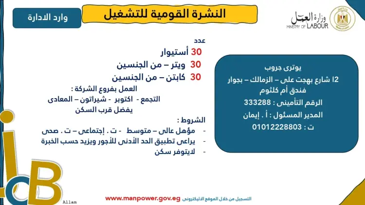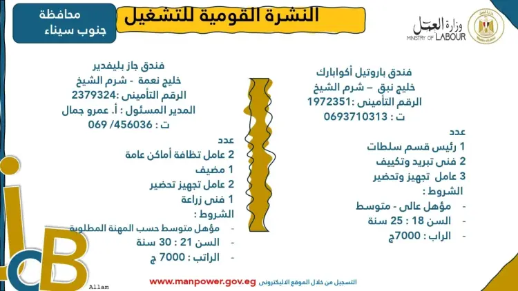 أعلنت وزارة العمل اليوم الإثنين الموافق 17 نوفمبر 2025، عن إصدار نشرة التوظيف نصف الشهرية الجديدة، التي توفر 4,202 فرصة عمل جديدة لدى 53 شركة من القطاع الخاص في 14 محافظة.