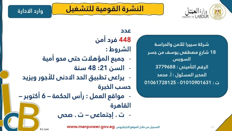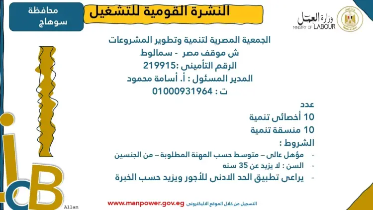 دعم ذوي الهمم: تتضمن النشرة وظائف مخصصة لأصحاب القدرات الخاصة، تنفيذا للقانون رقم 10 لسنة 2018، الذي يلزم بتخصيص نسبة 5% من عمال المنشآت لهذه الفئة.
