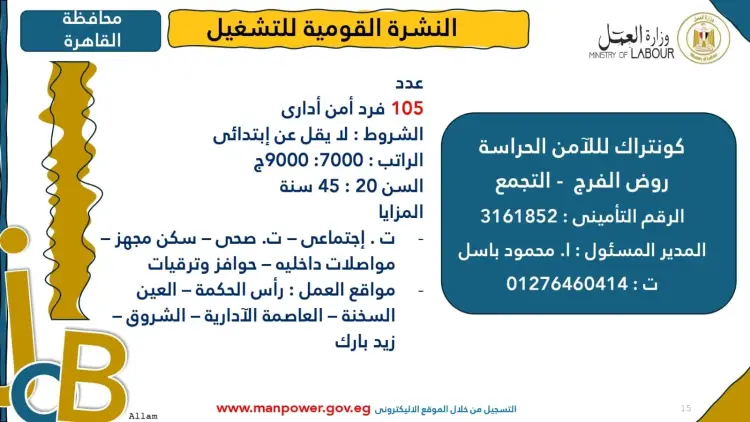 وأوضحت الوزارة أن التقديم يتم عبر الإدارة العامة للتشغيل بمقر الوزارة القديم بمدينة نصر، أو من خلال مديريات العمل بالمحافظات، أو بالتواصل مباشرة مع الشركات المرفقة بياناتها بالنشرة، أو عبر الموقع الرسمي لوزارة العمل.
