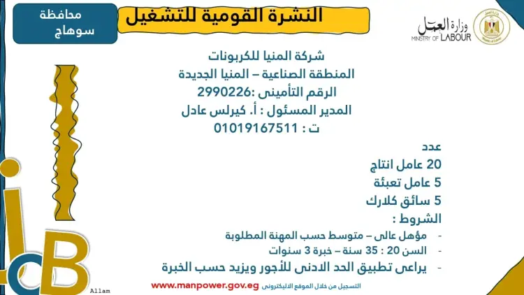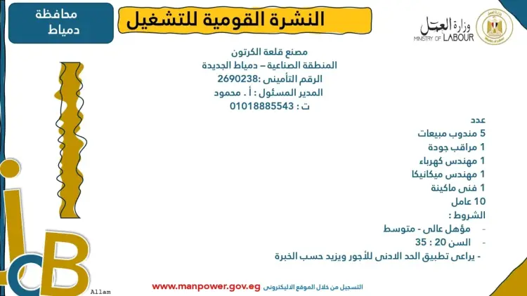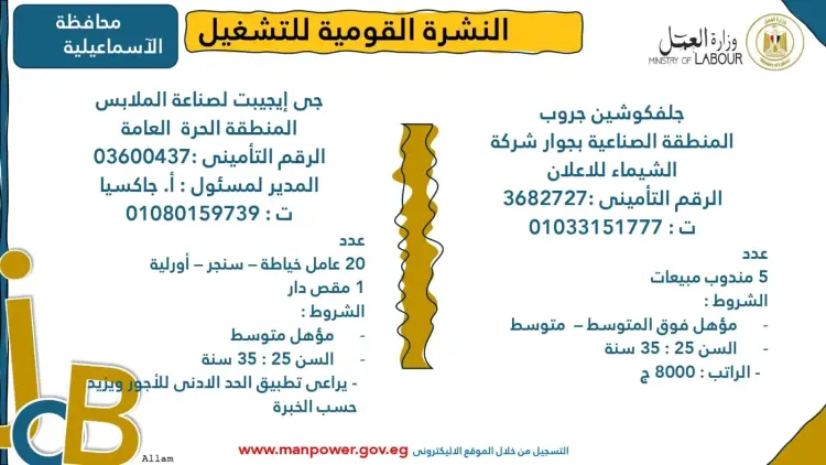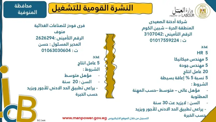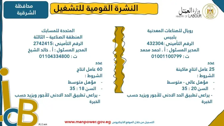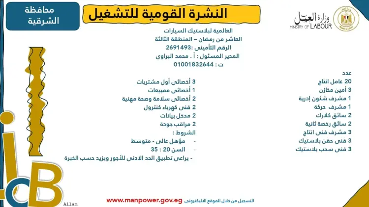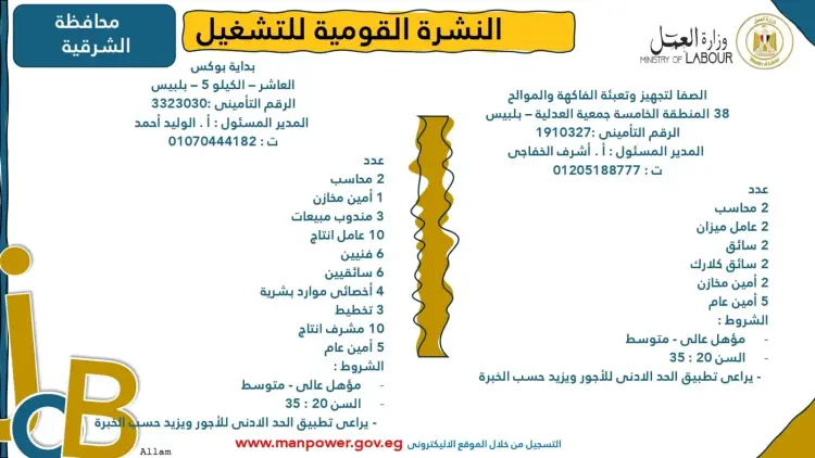 تضمنت النشرة تفاصيل بعض فرص العمل المتاحة في محافظة الشرقية، وتحديدا بمنطقة العاشر من رمضان، ومنها: