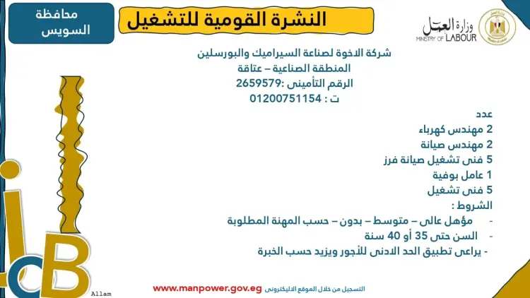 الشروط: مؤهل عالى أو متوسط، السن من 20 إلى 35 سنة.