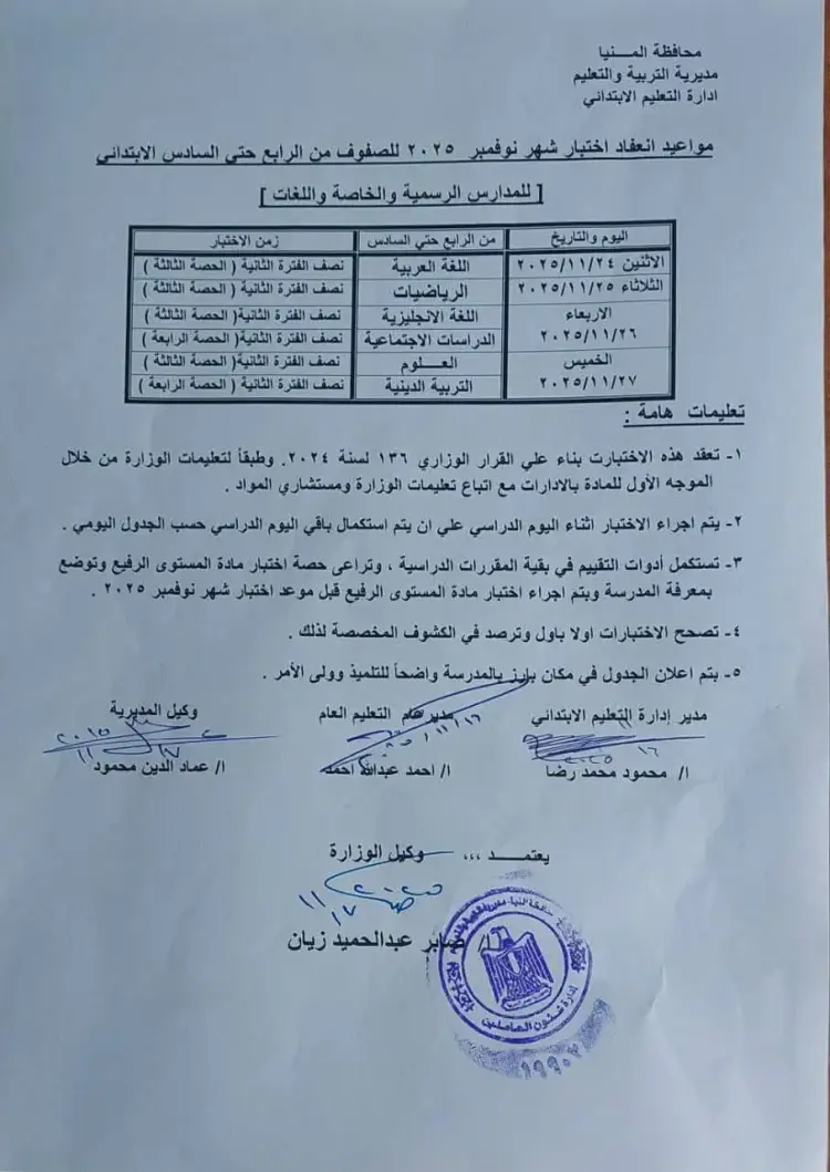جدول امتحانات شهر نوفمبر خامسة ابتدائي 2025 المنيا