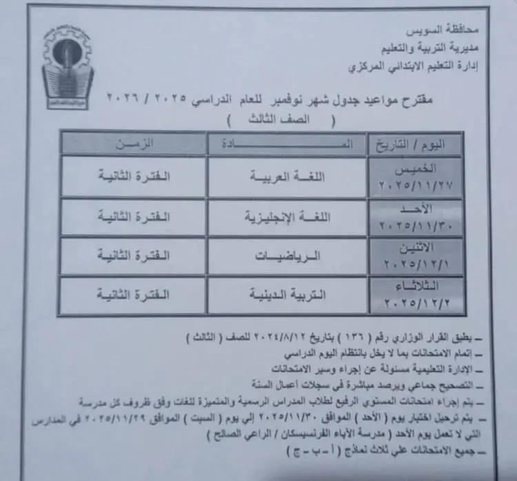 جدول امتحانات تالتة ابتدائي شهر نوفمبر بالسويس 2025 2026