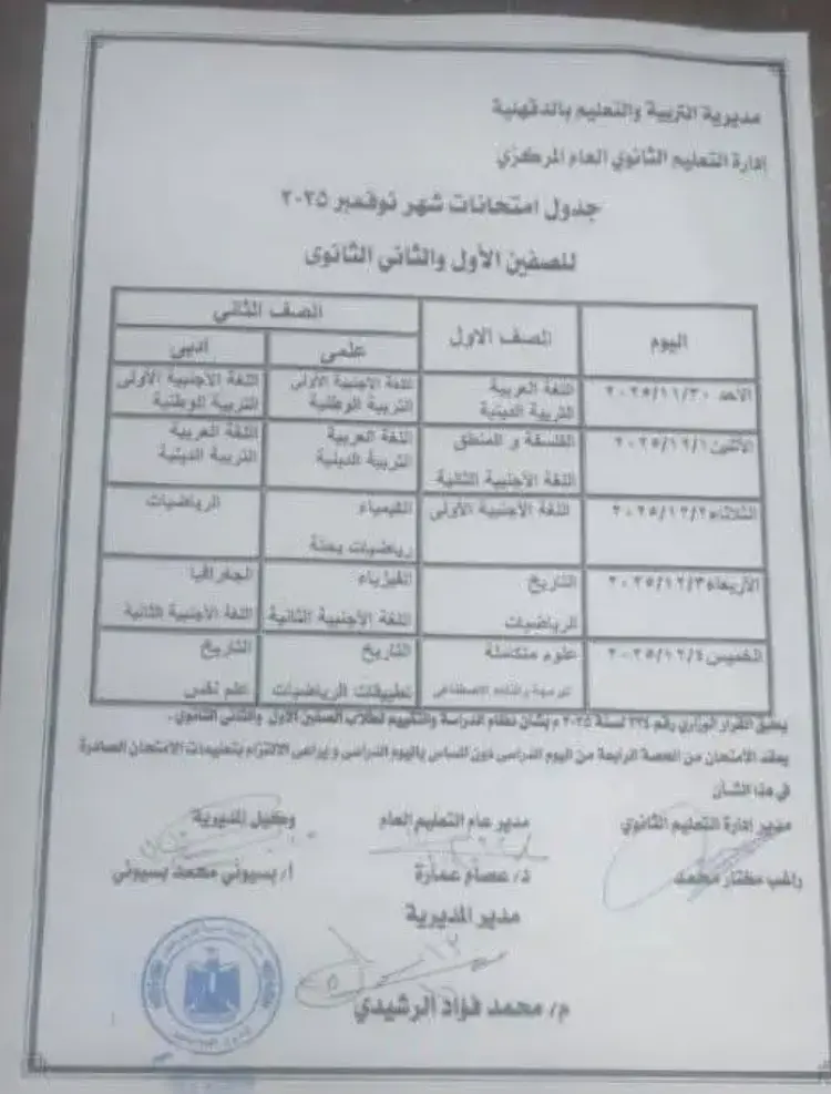 جدول امتحانات شهر نوفمبر أولى ثانوي 2025 الدقهلية