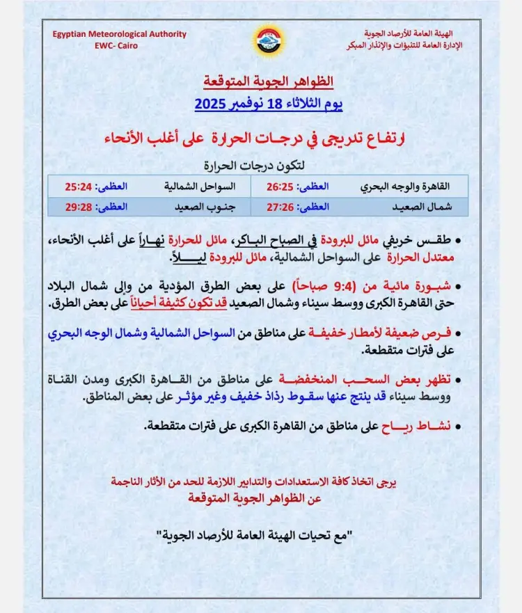 تتجه درجات الحرارة الثلاثاء، 18 نوفمبر 2025، نحو ارتفاع تدريجي على أغلب أنحاء الجمهورية، بحسب بيان الهيئة العامة للأرصاد الجوية.