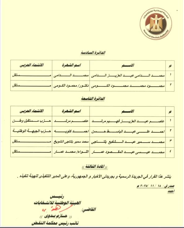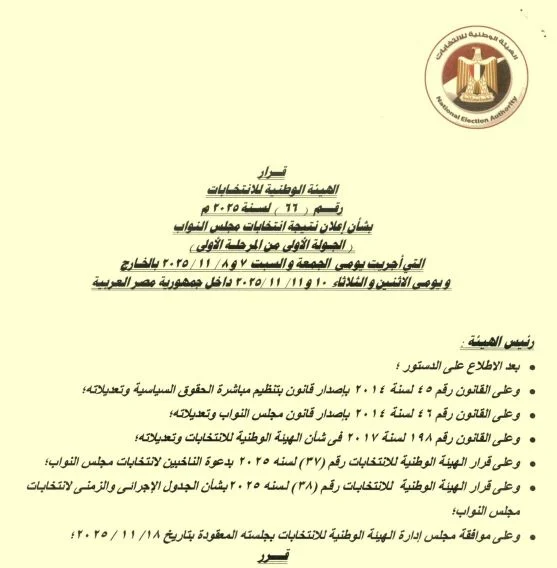 أصدرت الهيئة الوطنية للانتخابات برئاسة القاضي حازم بدوي، اليوم الثلاثاء، القرار رقم 66 لسنة 2025، المتضمن الكشف الرسمي عن أسماء المرشحين الذين سيخوضون جولة الإعادة في انتخابات مجلس النواب للمرحلة الأولى، بالإضافة إلى تحديد مواعيد الاقتراع.
