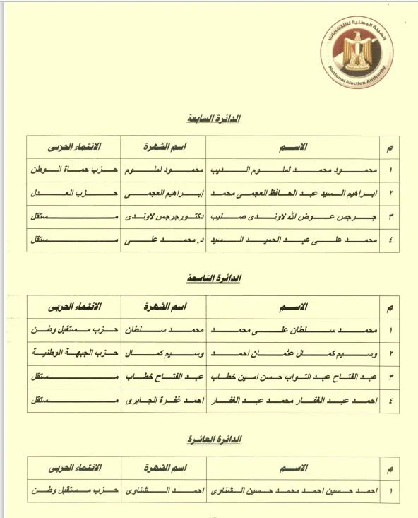 وفي الدائرة السابعة بالجيزة، تجرى الإعادة بين محمود محمد لملوم (حماة الوطن)، إبراهيم السيد عبد الحافظ (حزب العدل)، جرجس عوض الله (مستقل)، ومحمد علي عبد الحميد (مستقل)، أما الدائرة التاسعة فتضم محمد سلطان (مستقبل وطن)، وسيم كمال عثمان (حزب الجبهة الوطنية)، عبد الفتاح عبد التواب (مستقل)، وأحمد عبد الغفار (مستقل).