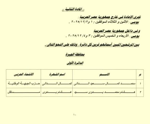 أسماء الإعادة في انتخابات مجلس الشعب 2025 المرحلة الأولى
