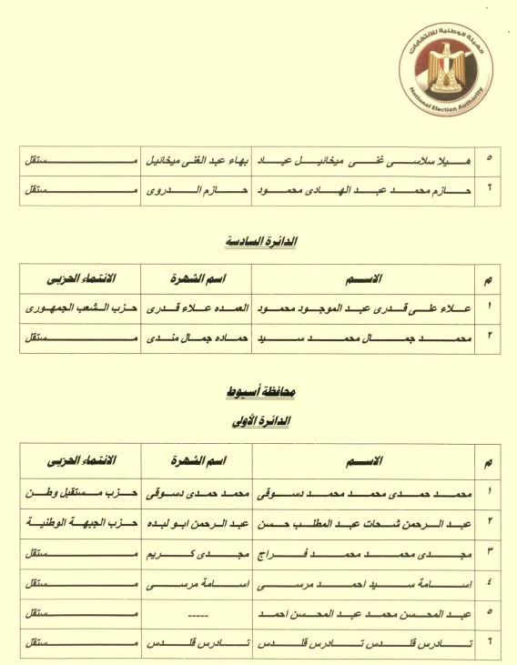 وكشفت القوائم في محافظة أسيوط عن إعادة في الدائرة الأولى بين: محمد حمدي محمد (مستقبل وطن)، عبد الرحمن شحات (حزب الجبهة الوطنية)، مجدي محمد فراج (مستقل)، أسامة سيد أحمد (مستقل)، عبد المحسن محمد (مستقل)، وتادرس قلدس (مستقل).