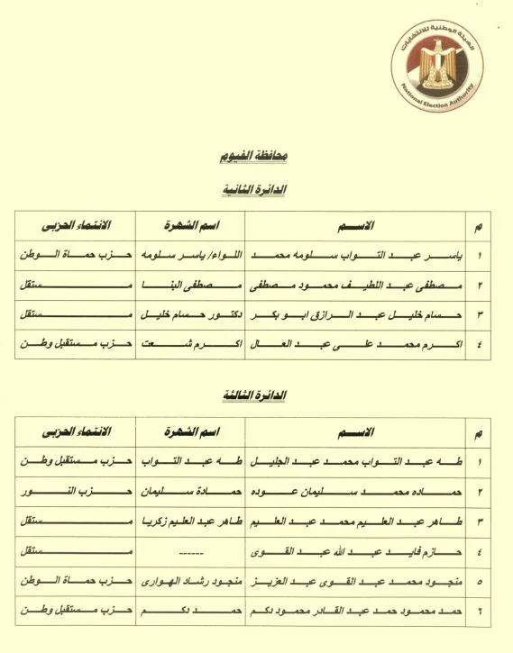 واختتمت القوائم بمحافظة الفيوم، حيث يتنافس في الدائرة الثانية ياسر عبد التواب (حماة الوطن)، مصطفى عبد اللطيف (مستقل)، حسام خليل (مستقل)، وأكرم محمد علي (مستقبل وطن). وفي الدائرة الثالثة: طه عبد التواب (مستقبل وطن)، حمادة محمد سليمان (النور)، طاهر عبد العليم (مستقل)، حازم فايد (مستقل)، منجود محمد (حماة الوطن)، وحمد محمود (مستقبل وطن).