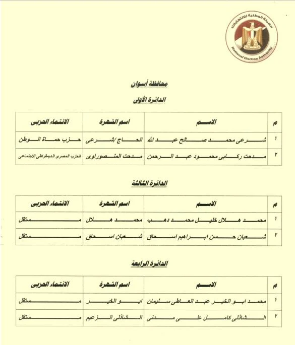وشهدت محافظة أسوان إعادة في الدائرة الأولى بين شرعي محمد صالح (حماة الوطن) ومدحت ركابي (المصري الديمقراطي)، وفي الثالثة بين محمد هلال خليل (مستقل) وشعبان حسن (مستقل)، وفي الرابعة بين محمد أبو الخير (مستقل) والشاذلي كامل (مستقل).