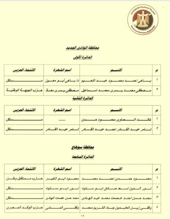 وفي سوهاج، اقتصرت الإعادة المعلنة في الدائرة السابعة على: محمود حمدي أحمد (مستقبل وطن)، نور الدين أسعد (مستقل)، محمد حسن أحمد (مستقل)، ووفقي زين العابدين (الوفد المصري).