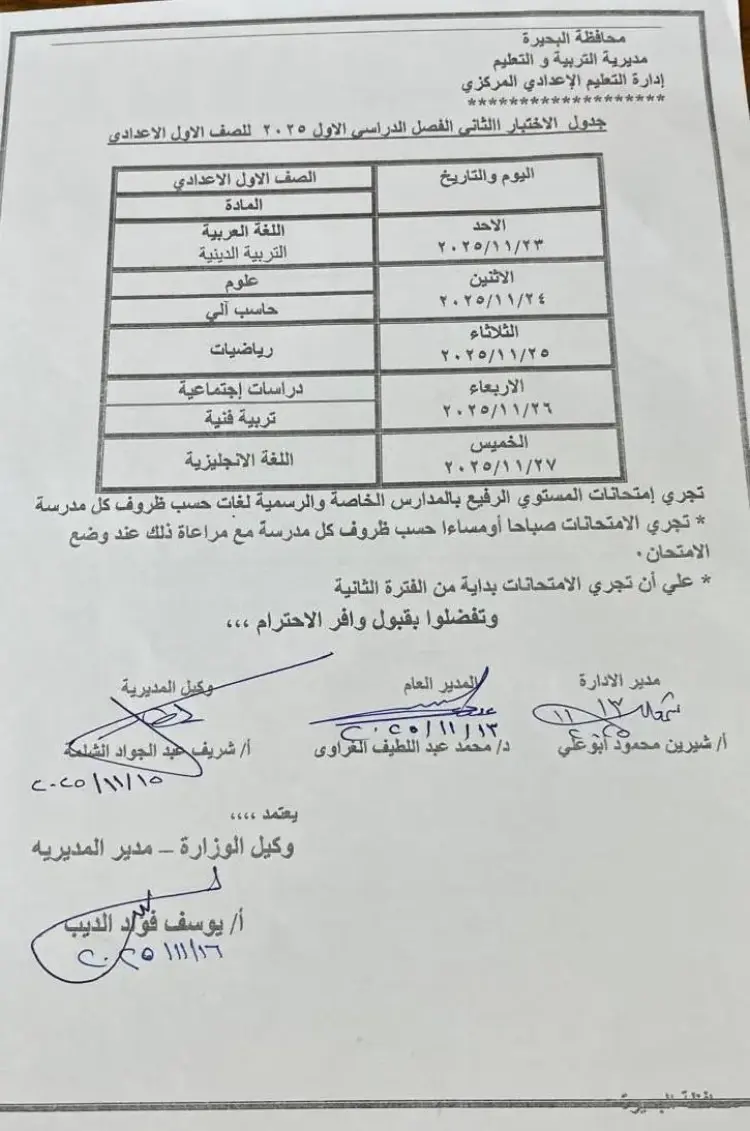 جدول امتحانات شهر نوفمبر أولى إعدادي محافظة البحيرة 2025