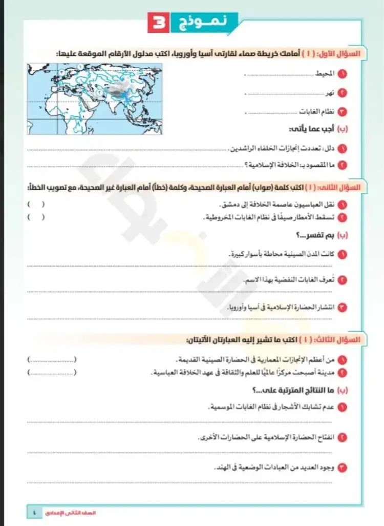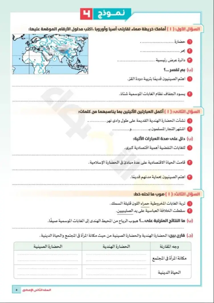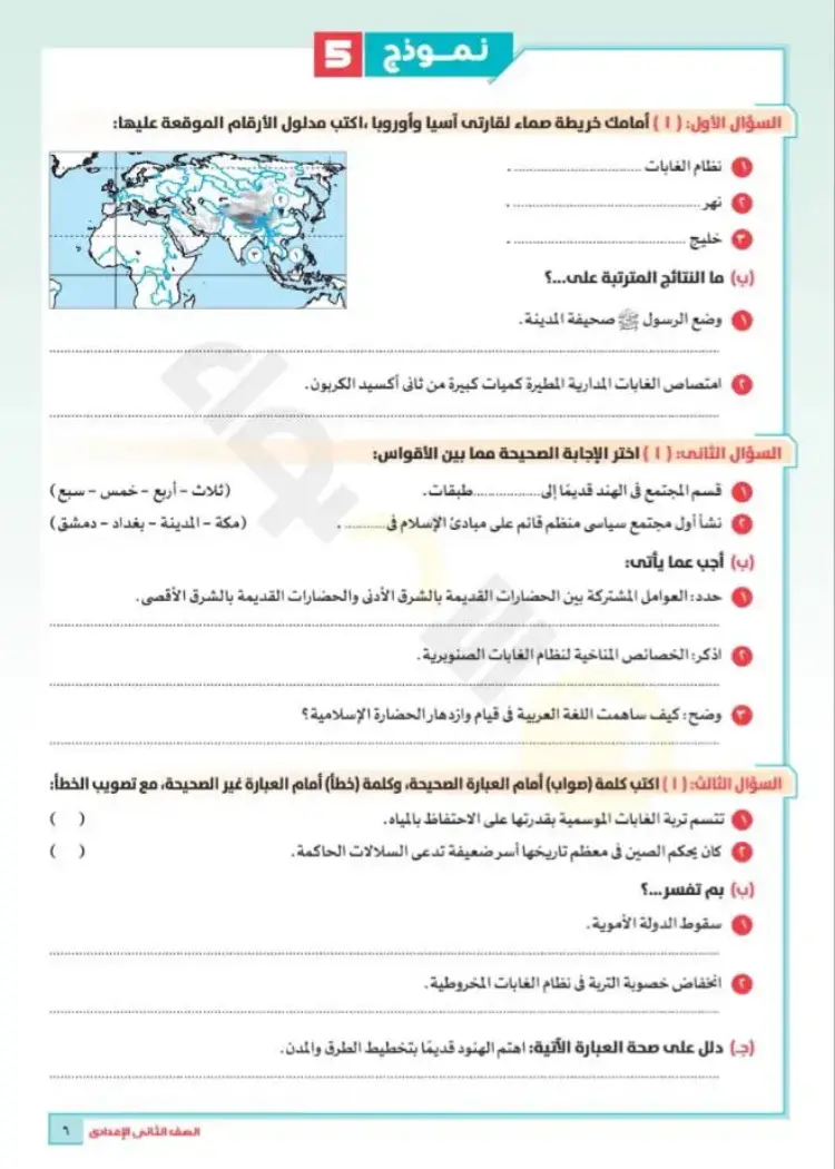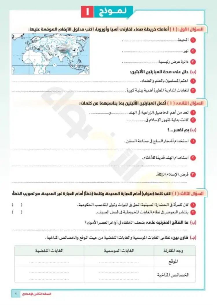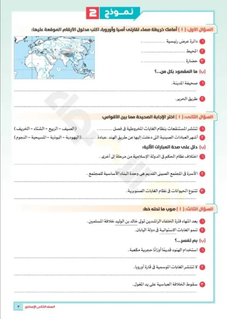 وتشمل نماذج امتحانات شهر نوفمبر في كتاب الأضواء دراسات للصف الثاني الإعدادي بالعام الدراسي 2025 2026، على العديد من نماذج الأسئلة منها: