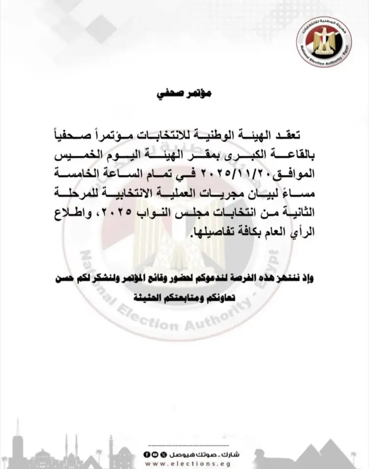 تستعد الهيئة الوطنية للانتخابات لعقد مؤتمر صحفي اليوم الخميس الموافق 20 نوفمبر 2025، في مقرها الرئيسي، وذلك قبل ساعات من بدء فترة الصمت الدعائي وانطلاق عمليات الاقتراع للمرحلة الثانية من انتخابات مجلس النواب 2025.