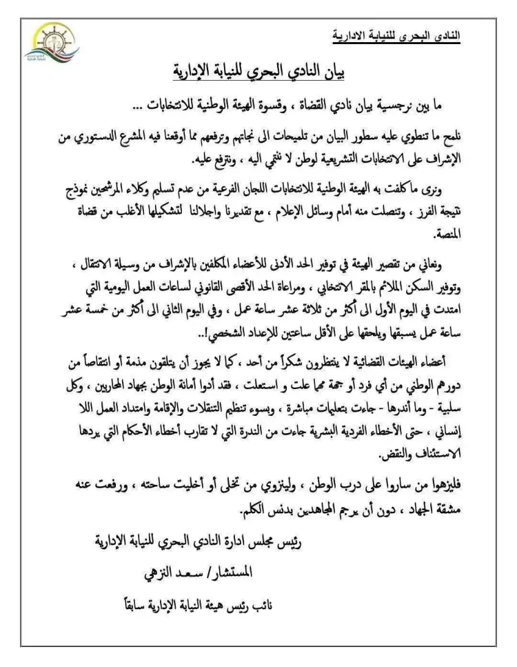 وجاء هذا الرد من النادي البحري للنيابة الإدارية على خلفية بيان سابق صادر عن نادي قضاة مصر يوم الثلاثاء، والذي أعلن فيه عدم مشاركة القضاة وأعضاء النيابة العامة في الإشراف على الانتخابات البرلمانية لعام 2025.