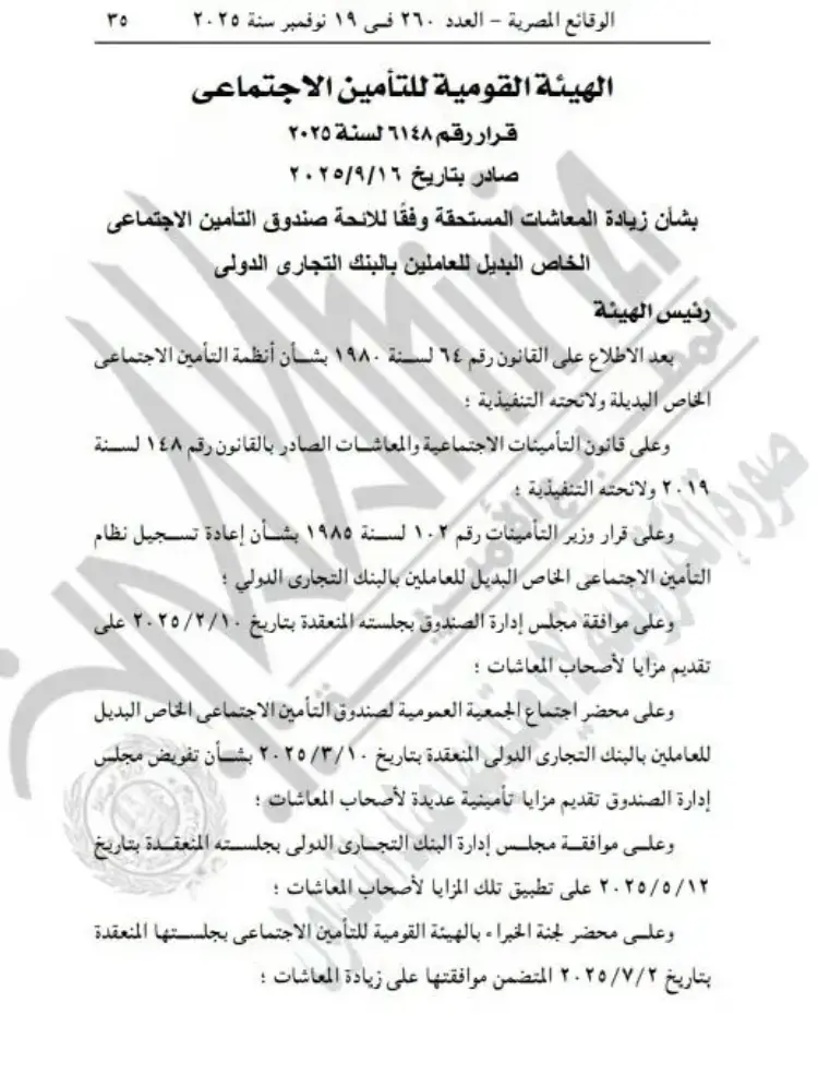 صدر القرار بتاريخ 16 سبتمبر 2025 عن رئيس الهيئة القومية للتأمين الاجتماعي، اللواء جمال عوض محمود، ليحدد آليات زيادة المعاشات وتطبيقها على المستفيدين.