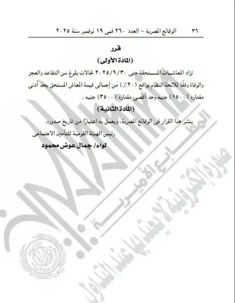تُقرر المادة الأولى زيادة المعاشات بواقع نسبة ثابتة تبلغ 20%، من إجمالي قيمة المعاش الذي يستحقه المستفيد.
