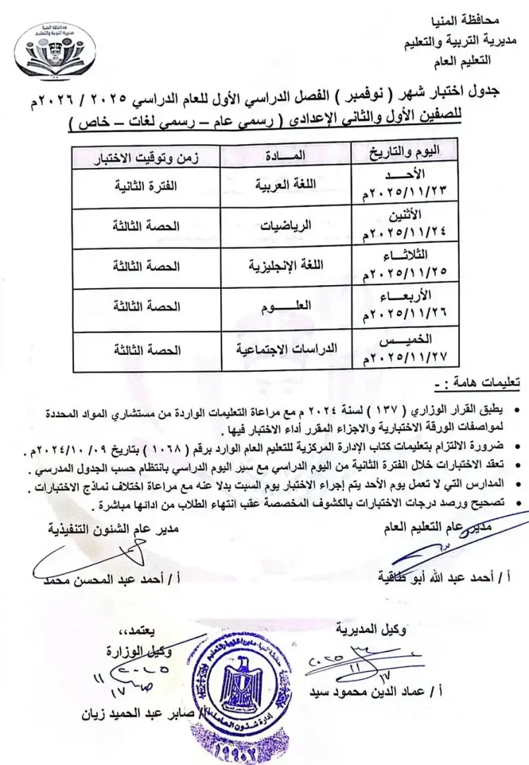 جدول امتحانات شهر نوفمبر أولى إعدادي محافظة المنيا 2025