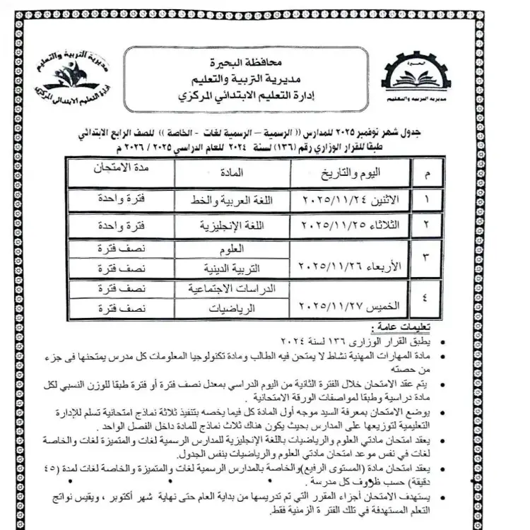جدول امتحانات شهر نوفمبر الصف الرابع الابتدائي 2025 البحيرة
