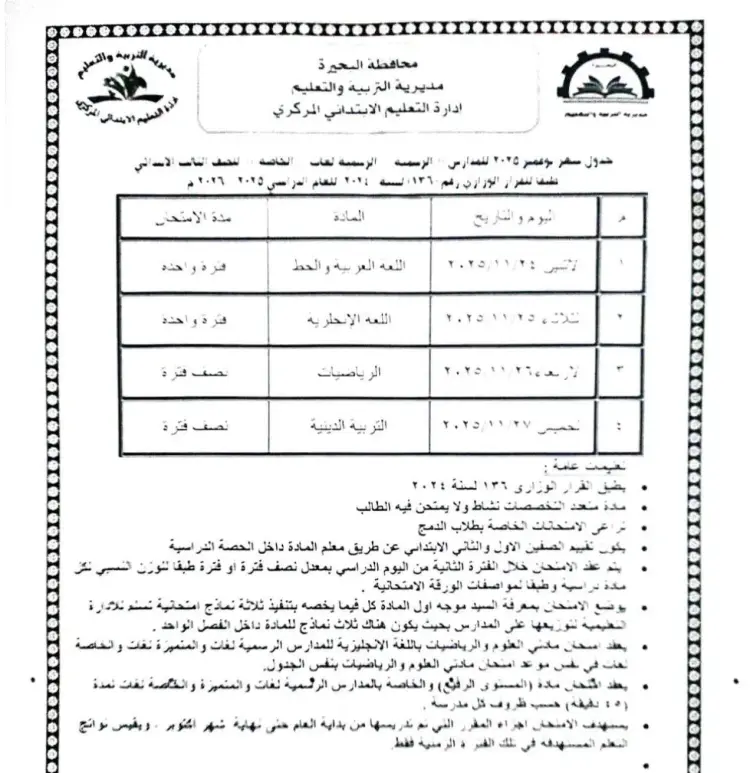 جدول امتحانات شهر نوفمبر تالتة ابتدائي 2025 البحيرة