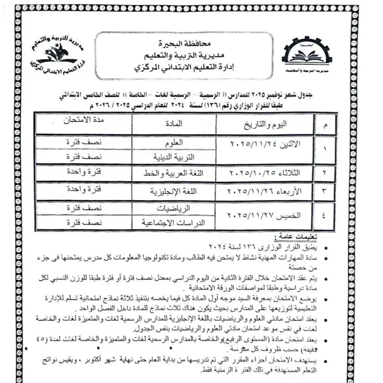 جدول امتحانات شهر نوفمبر خامسة ابتدائي 2025 البحيرة