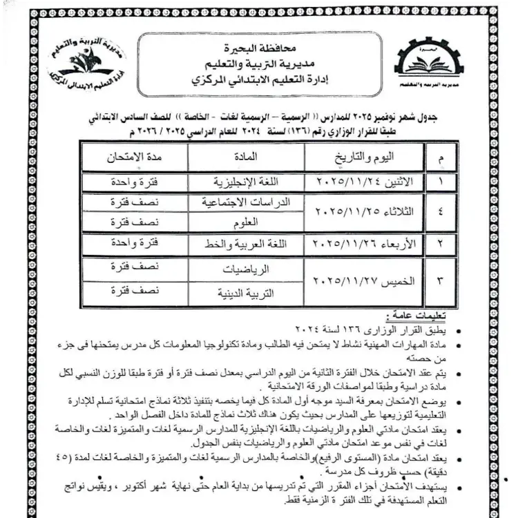 جدول امتحانات شهر نوفمبر الصف السادس الابتدائي 2025 البحيرة