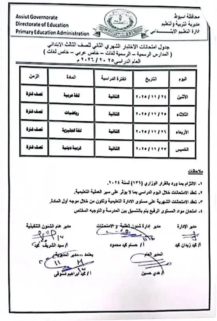 جدول امتحانات تالتة ابتدائي شهر نوفمبر 2025 محافظة أسيوط