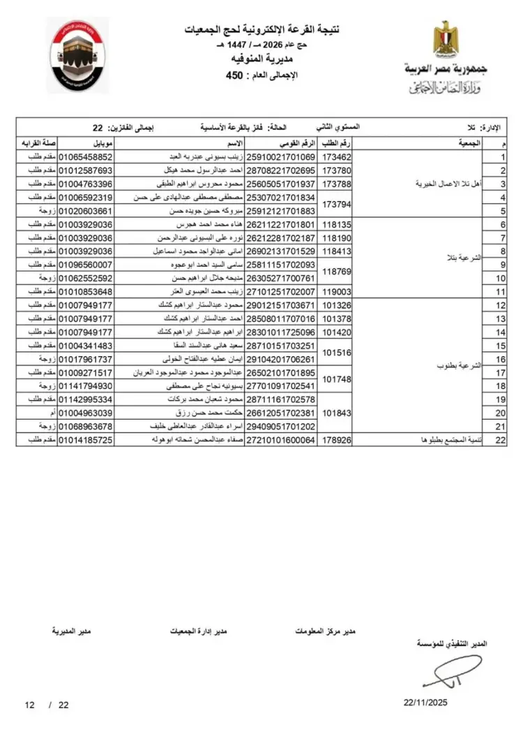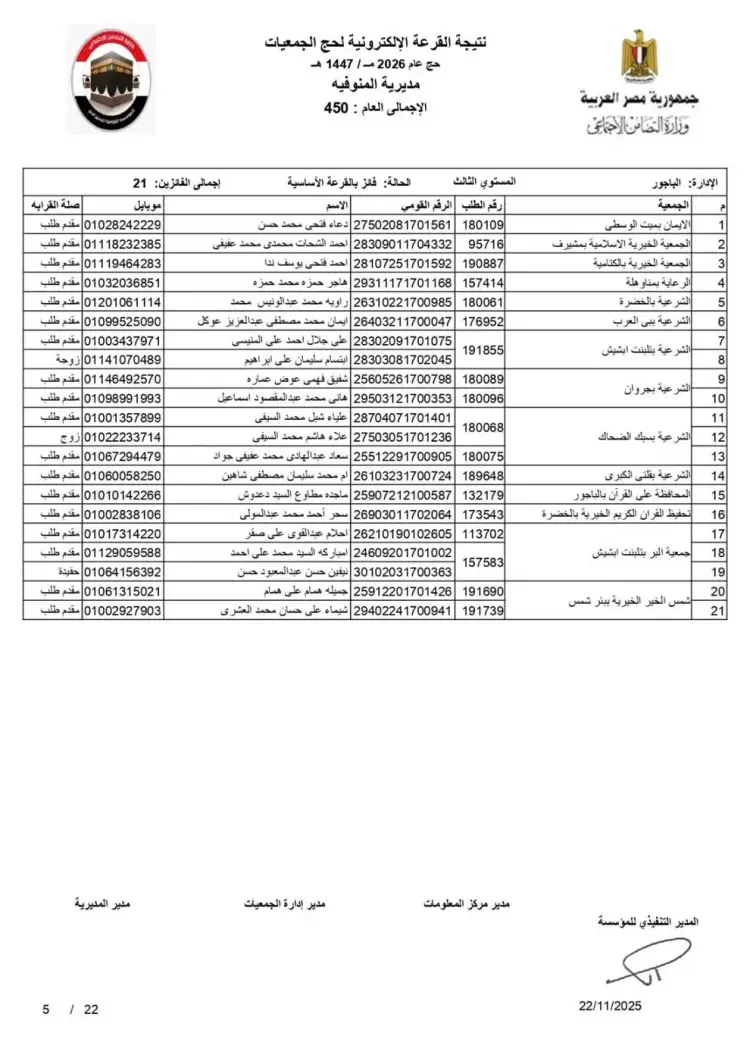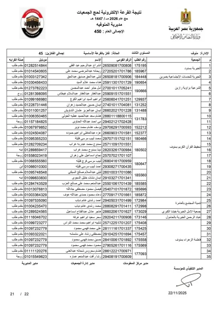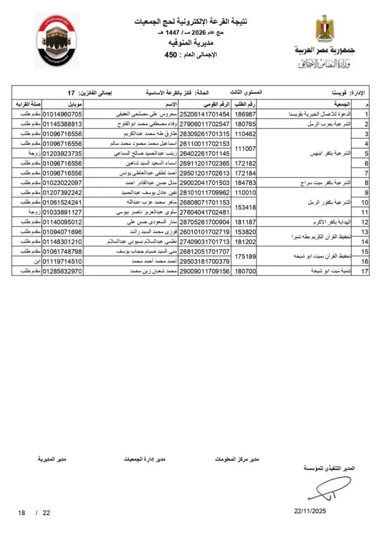 وتضمنت الكشوف المعلنة أسماء الحجاج موزعين على مختلف الإدارات الاجتماعية والمراكز بالمحافظة، ونستعرض فيما يلي بعض أسماء الفائزين في قرعة حج الجمعيات عن إدارتي «شبين الكوم» و«بركة السبع» كما وردت في الكشوف الرسمية: