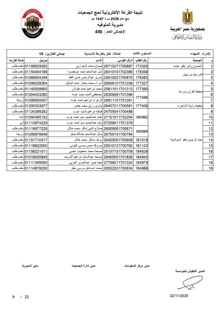 أسماء الفائزين بقرعة حج الجمعيات الأهلية 2026 بمحافظة المنوفية