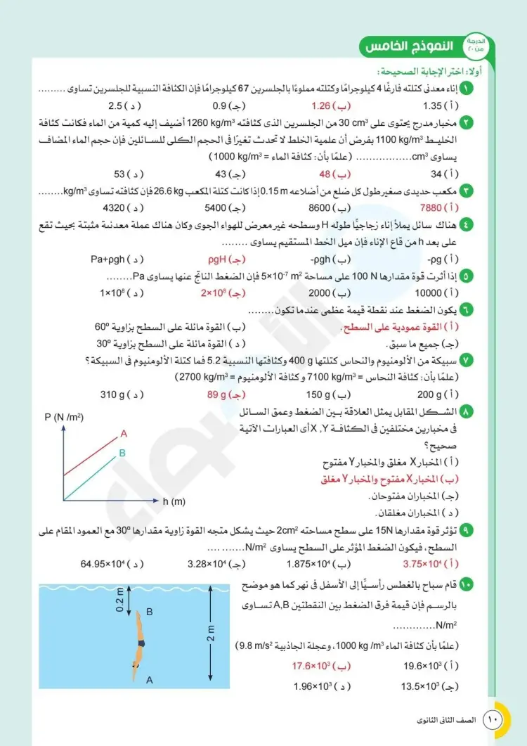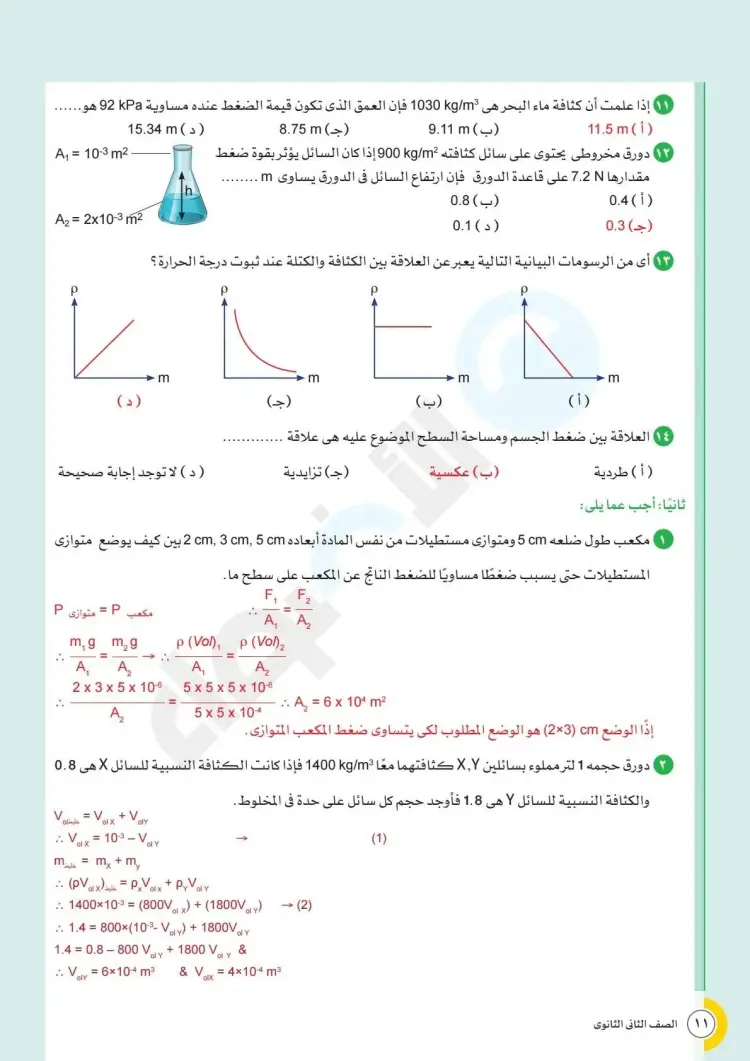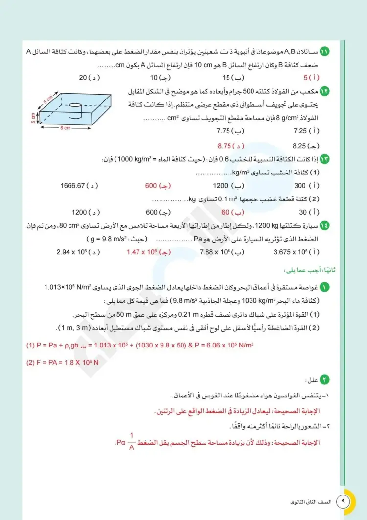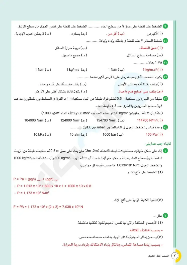 - المسألة الحسابية: إناء على شكل متوازي مستطيلات أبعاد قاعدته (2m, 3m) مملوء بالماء على عمق 0.8 m ثم سكبت طبقة من الزيت فغطت فوق سطح الماء بطبقة سمكها 1 m، فإذا علمت أن كثافة الزيت 800 kg/m³ وكثافة الماء 1000 kg/m³ والضغط الجوي 1.013 × 10^5 N/m². فاحسب قيمة كل مما يلي: