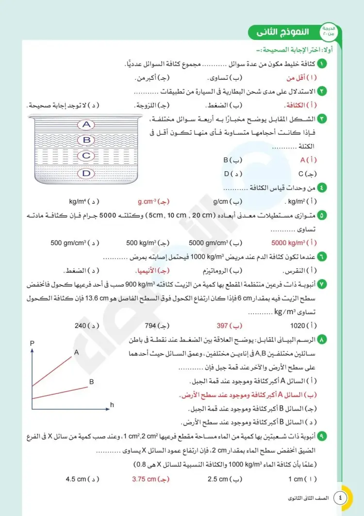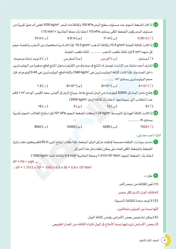 - السؤال 5: طبقة من الجازولين سمكها 0.5 m تعلو فوق طبقة من الماء سمكها 1 m ما الفرق في الضغط بين نقطتين إحداهما فوق سطح الجازولين والأخرى عند قاع طبقة الماء. علماً بأن كثافة الجازولين 690 kg/m³ وعجلة الجاذبية 9.8 m/s² وكثافة الماء 1000 kg/m³