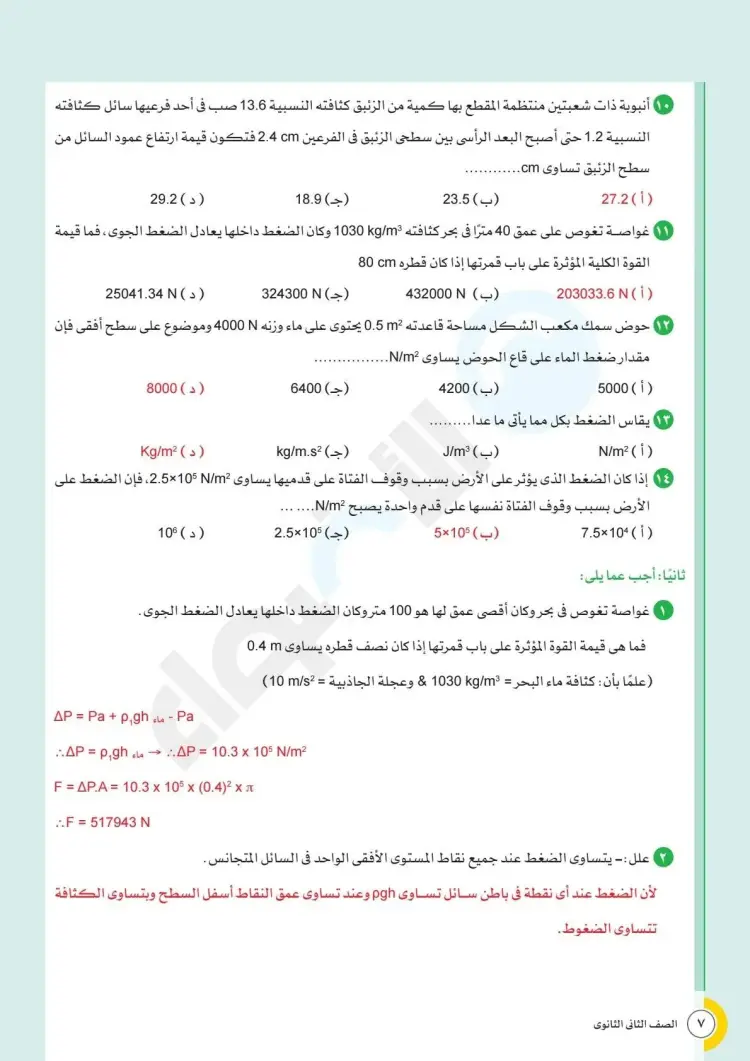 - السؤال 1: الضغط عند نقطة على عمق h من سطح الماء........................ الضغط عند نقطة على نفس العمق من سطح الزئبق.