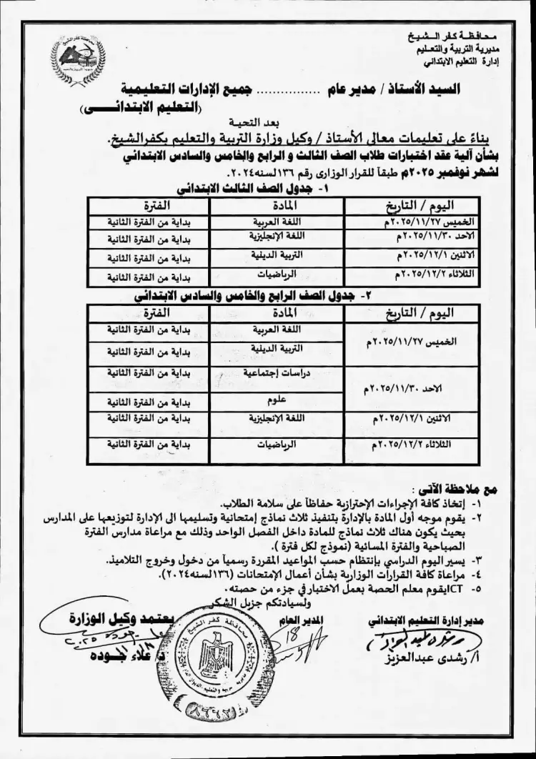 جدول امتحانات شهر نوفمبر خامسة ابتدائي 2025 كفر الشيخ