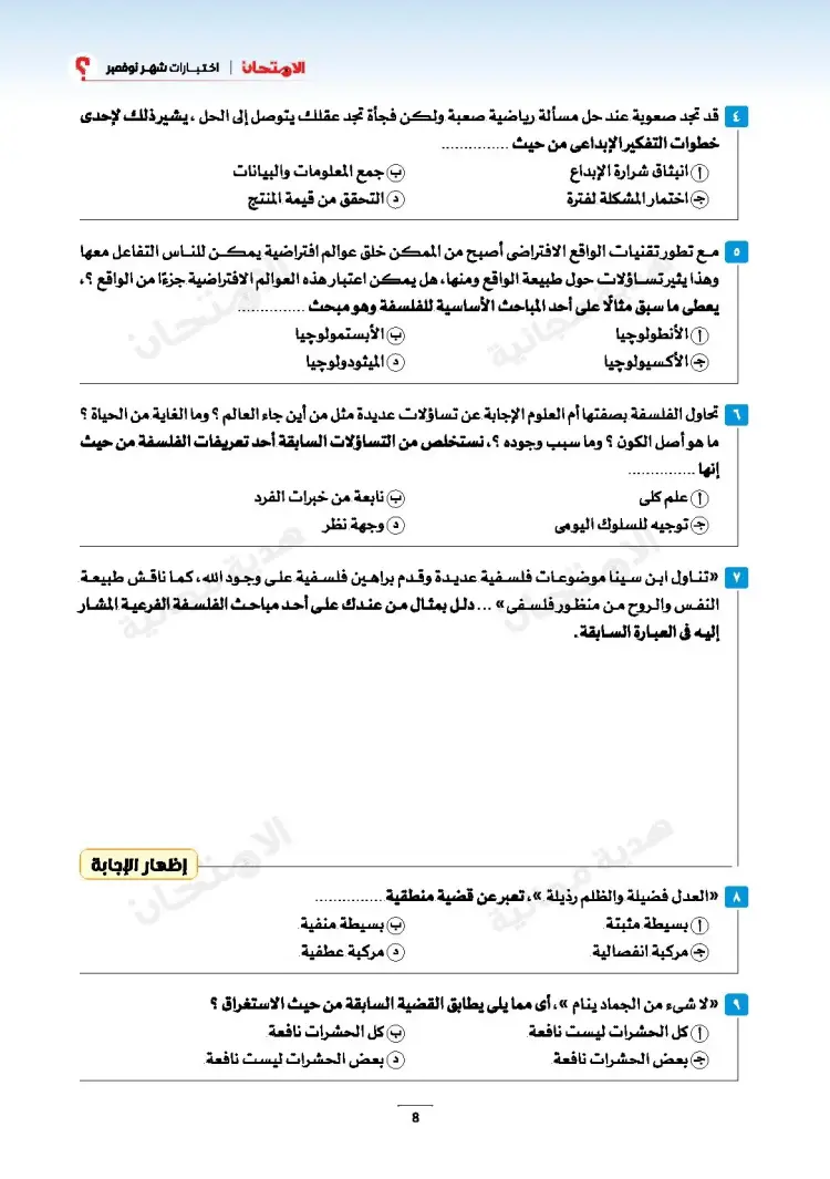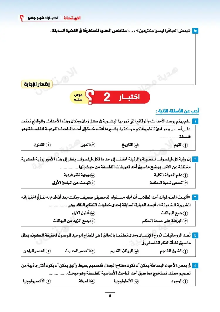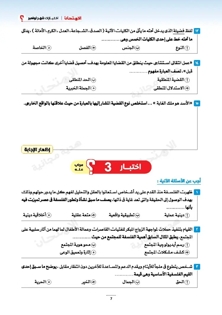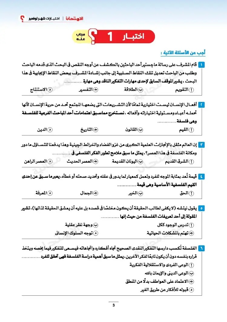 اختبارات كتاب الامتحان فلسفة الصف الأول الثانوي شهر نوفمبر 2025