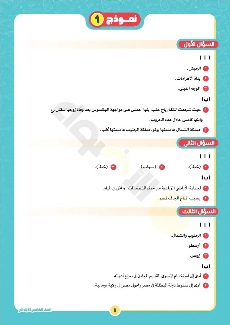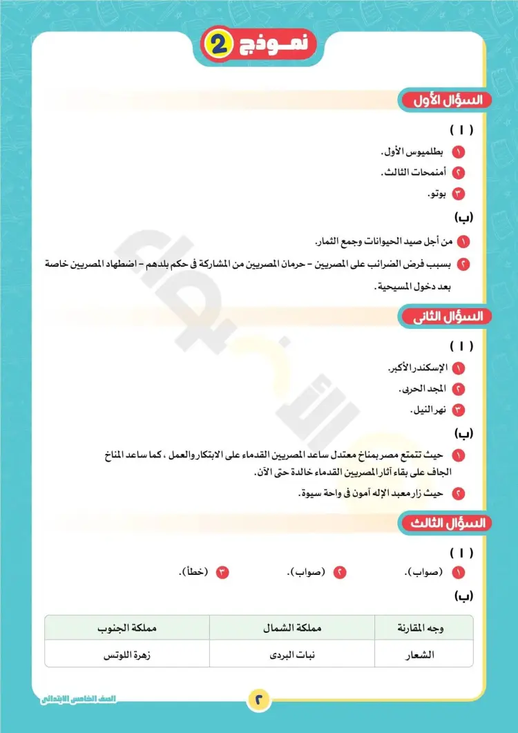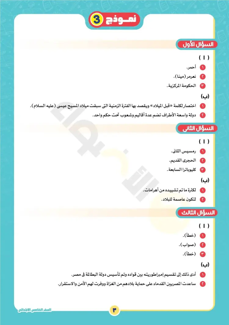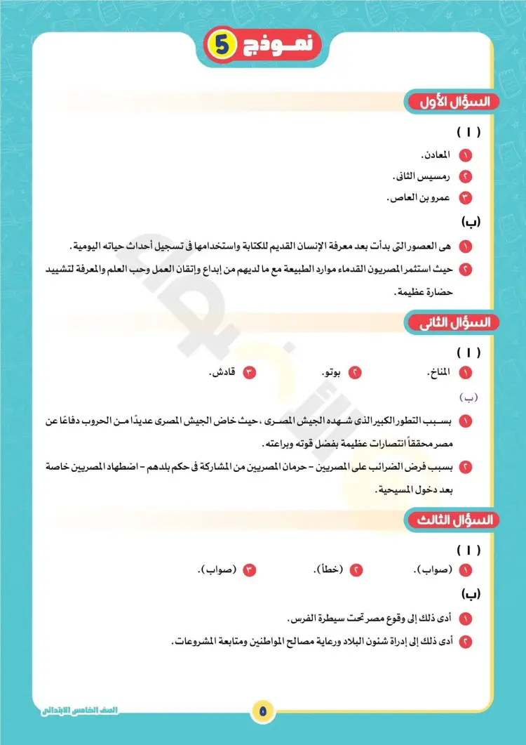 جاءت أسئلة امتحانات كتاب الأضواء شهر نوفمبر دراسات خامسة ابتدائي 2025 بالإجابات على النحو التالي: