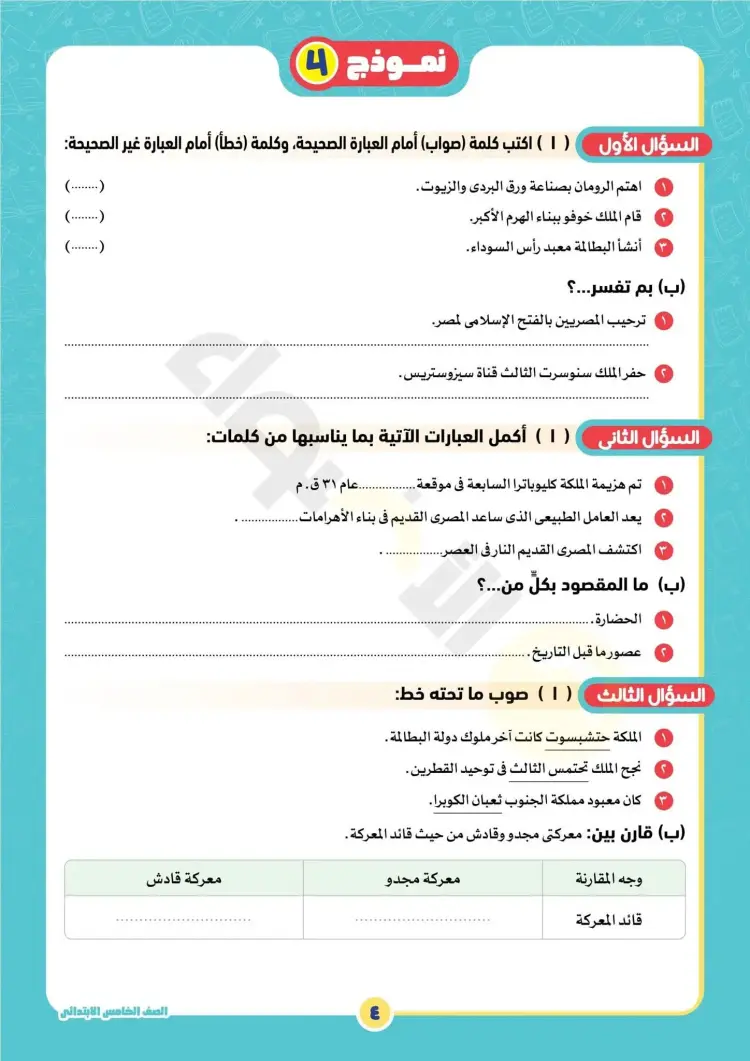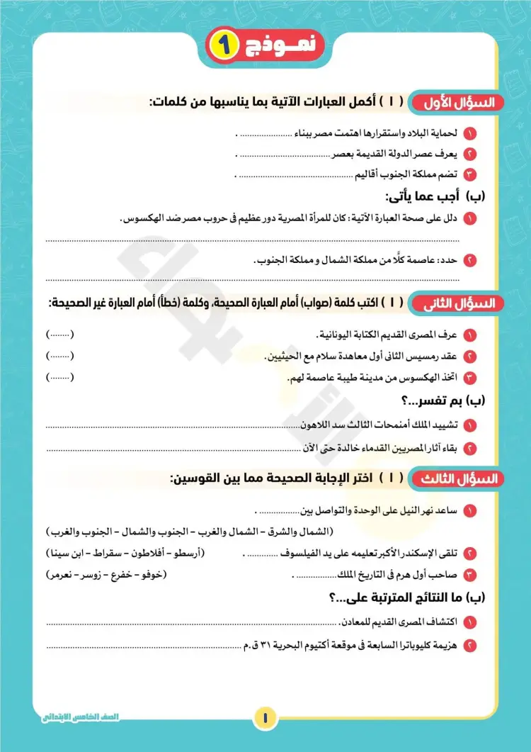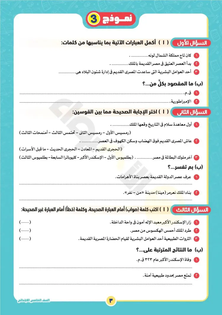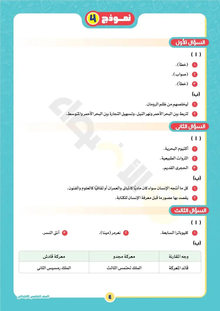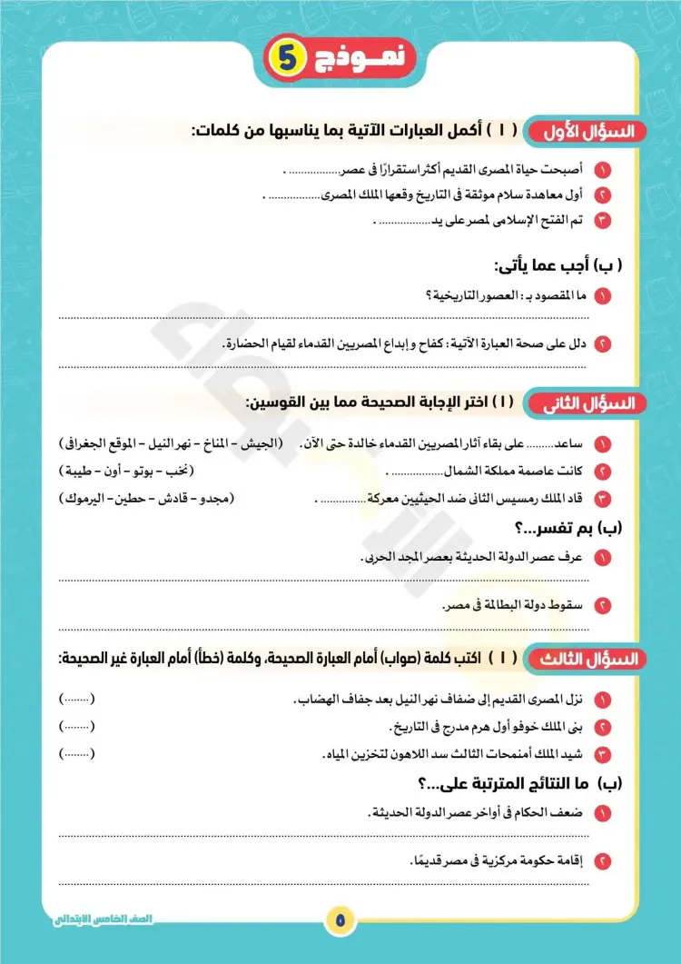 جاءت أسئلة امتحانات كتاب الأضواء شهر نوفمبر دراسات خامسة ابتدائي 2025 بالإجابات على النحو التالي: