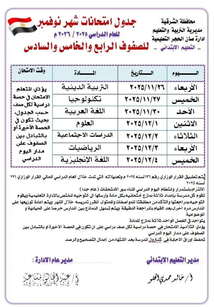 تبدأ امتحانات شهر نوفمبر خامسة ابتدائي محافظة الشرقية 2025 يوم الأربعاء 26 بالمواد الغير أساسية.