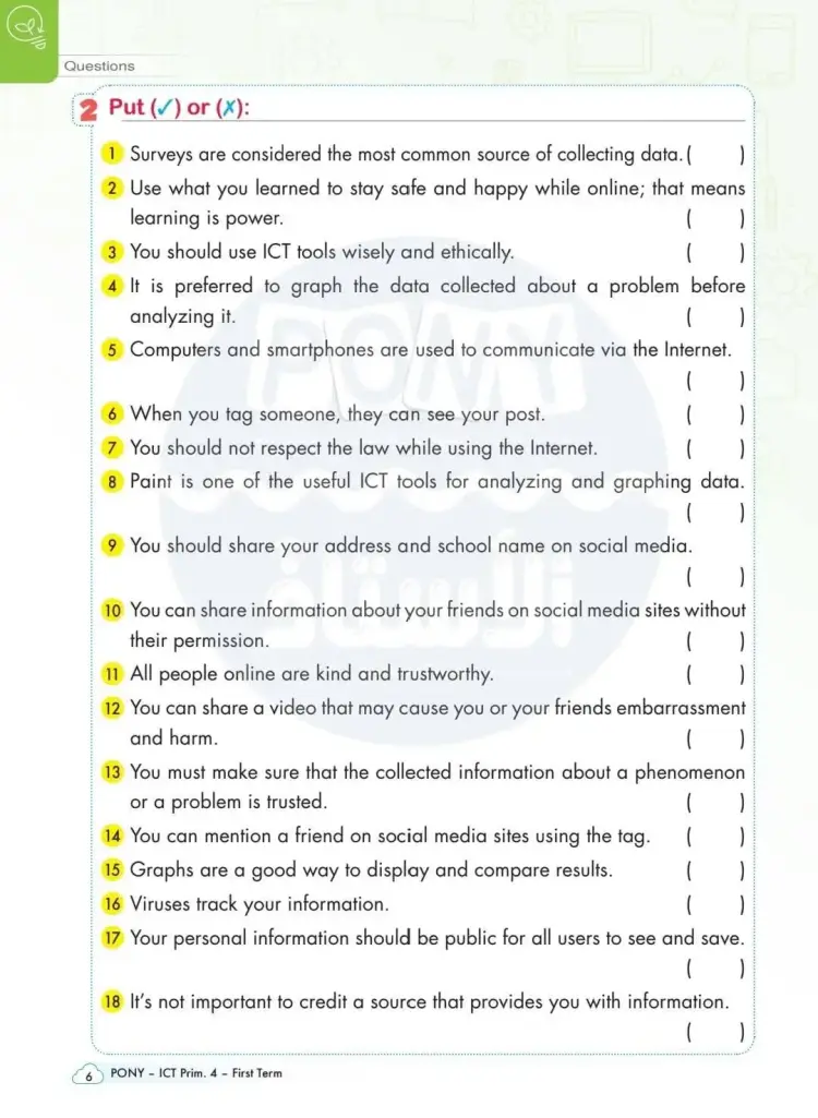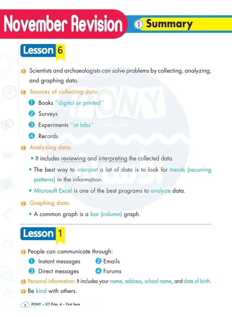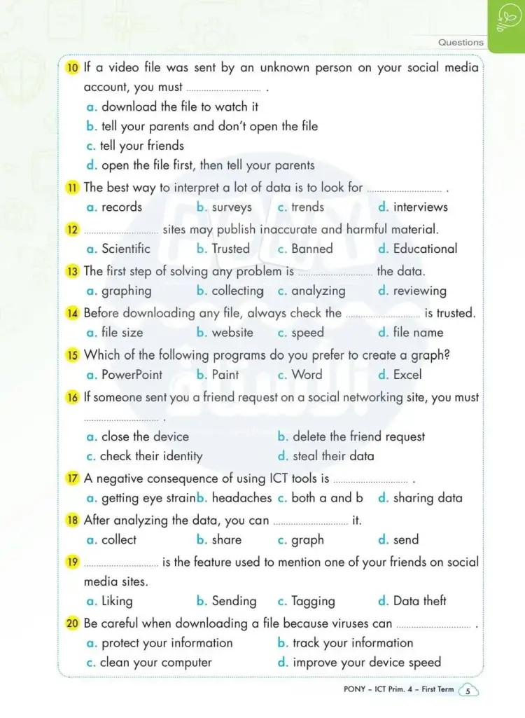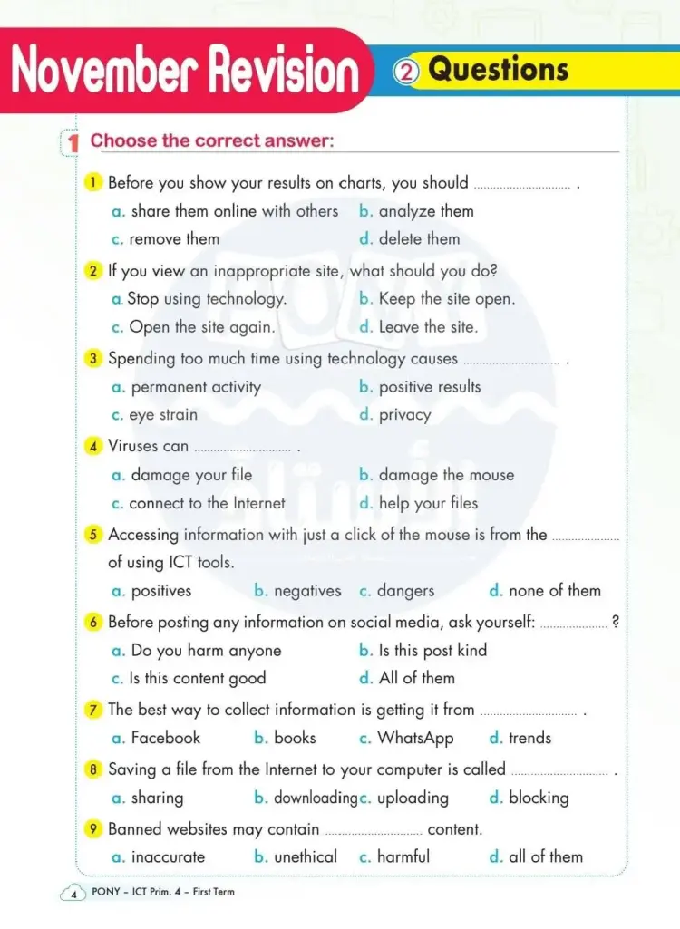 واشتملت مراجعة كتاب بوني Pony لشهر نوفمبر في مادة تكنولوجيا المعلومات والاتصالات بالانجليزي ict لطلاب الصف الرابع الابتدائي بالعام الدراسي 2025 2026، على العديد من الأسئلة منها ما يلي: