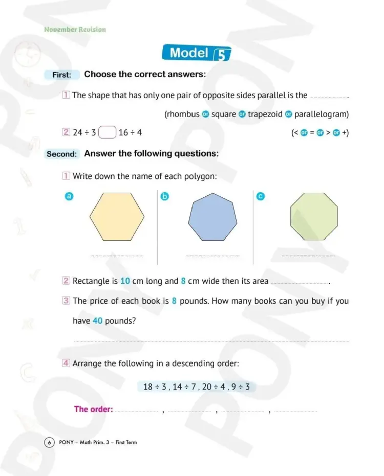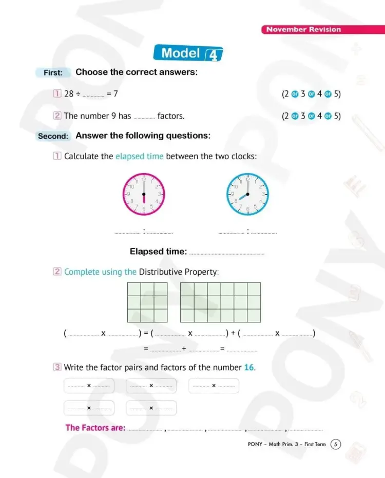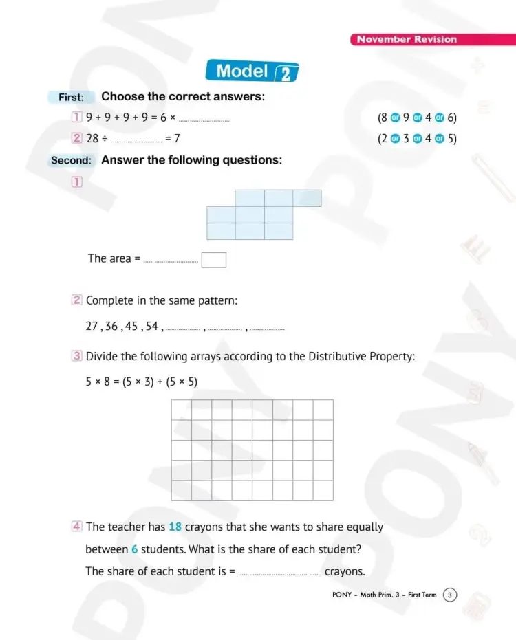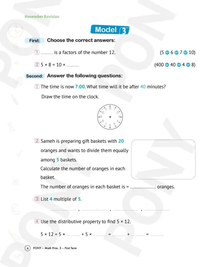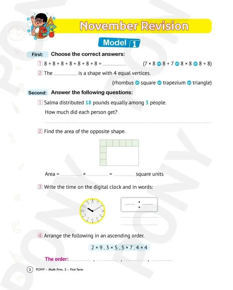 واشتملت مراجعة كتاب بوني Pony لشهر نوفمبر في مادة الرياضيات بالانجليزي math لطلاب الصف الثالث الابتدائي بالعام الدراسي 2025 2026، على العديد من الأسئلة منها ما يلي: