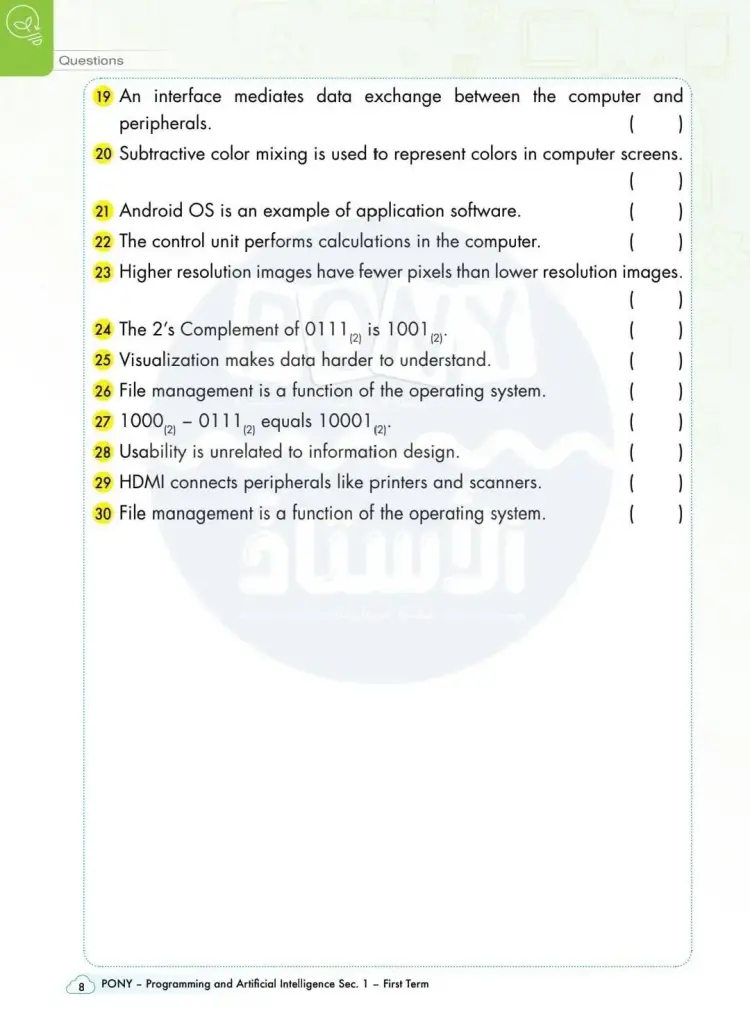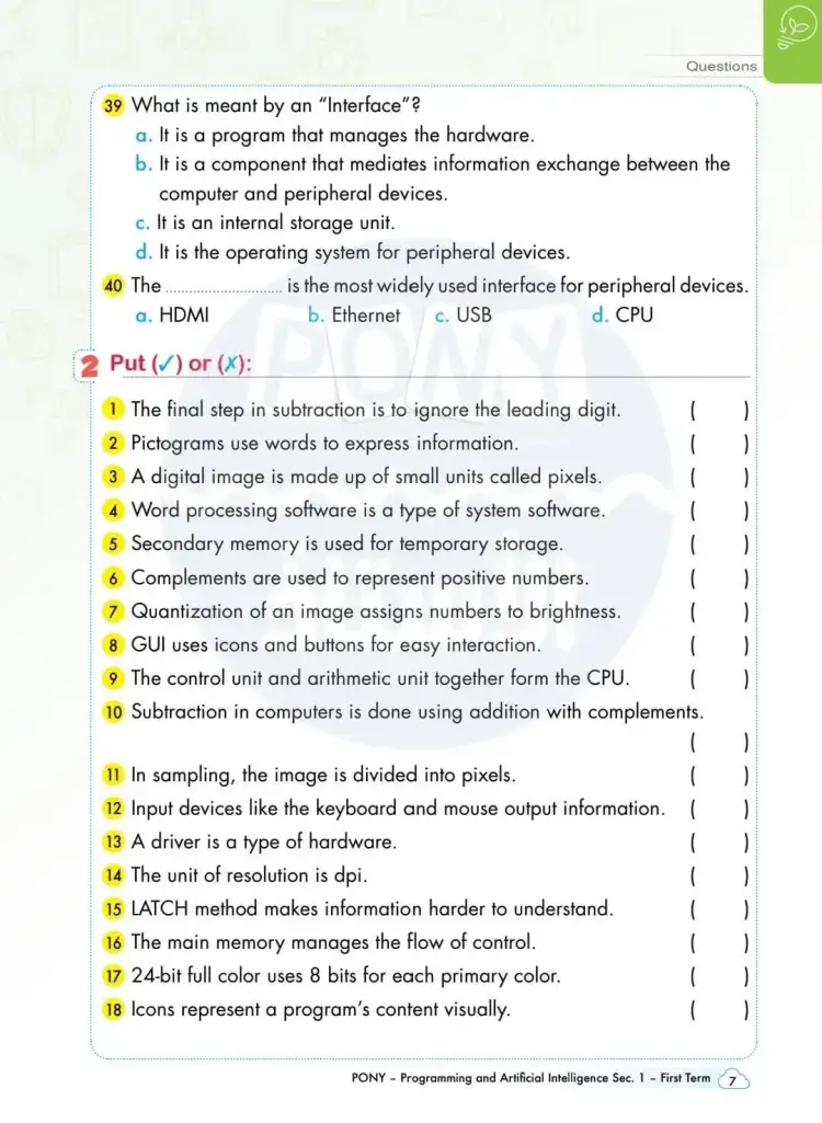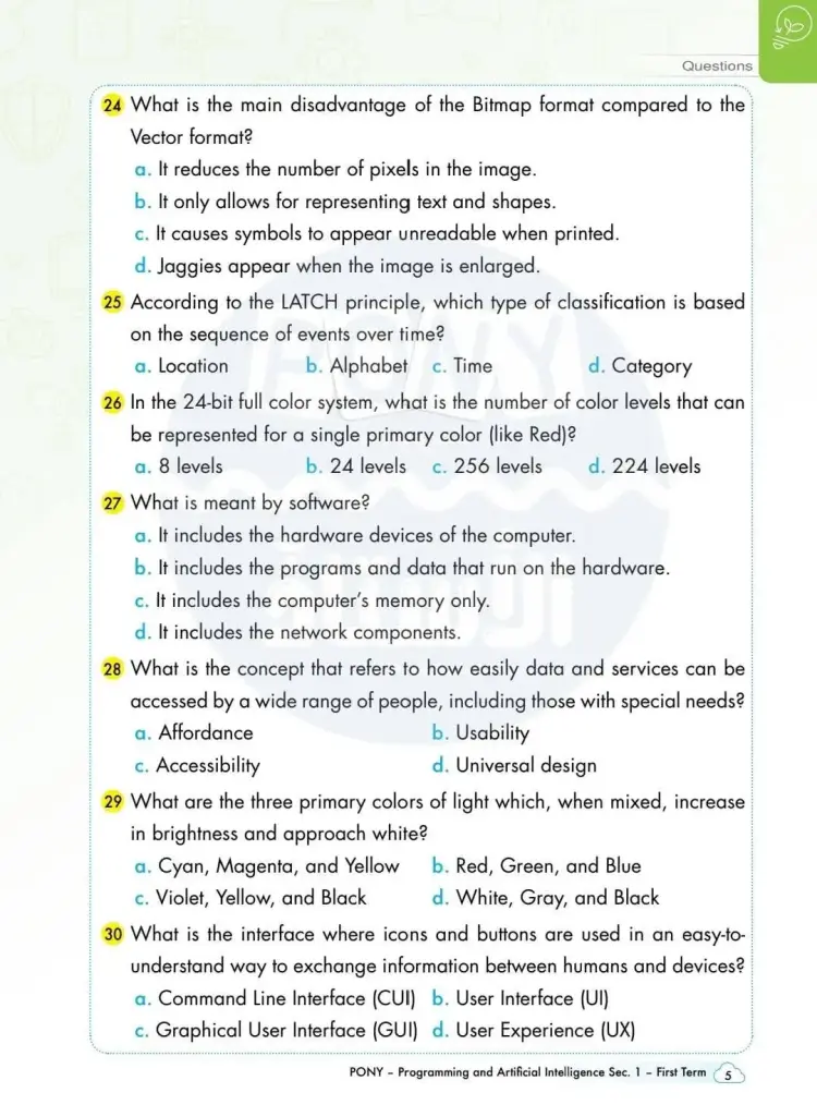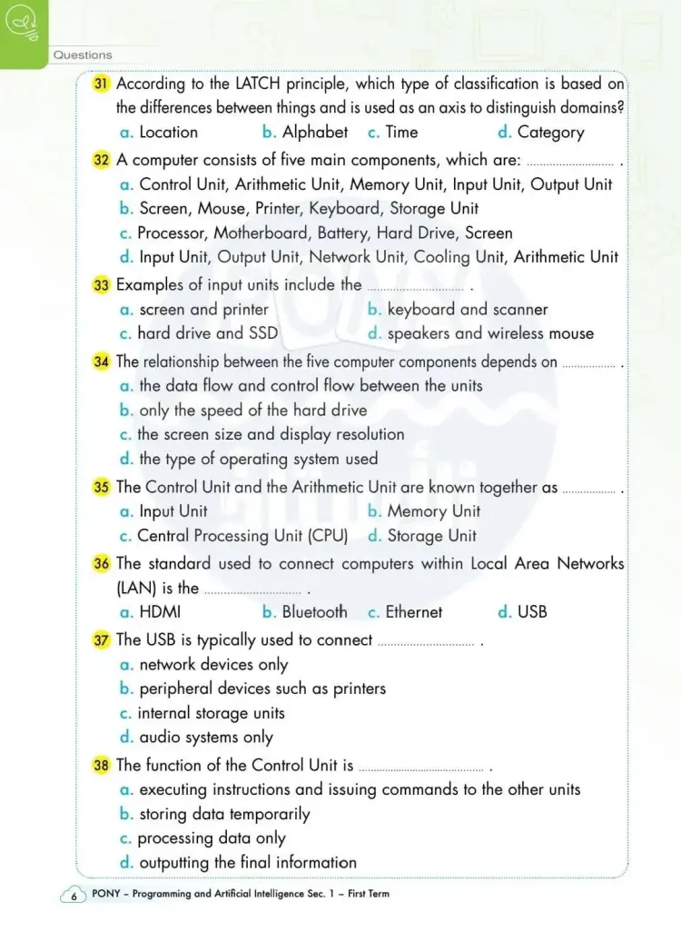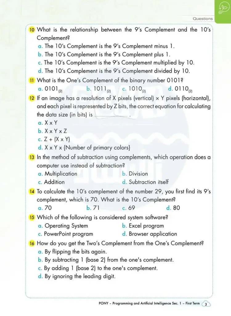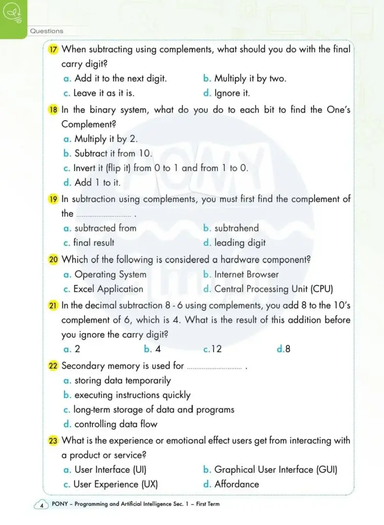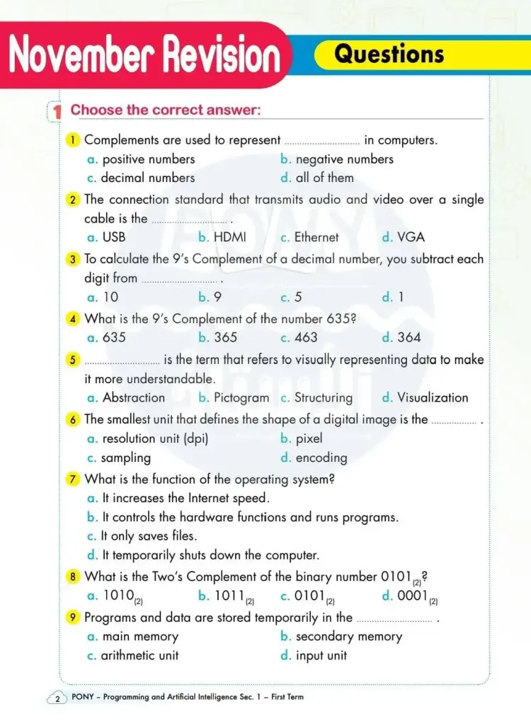 واشتملت مراجعة كتاب بوني Pony لشهر نوفمبر في مادة البرمجة والذكاء الاصطناعي بالإنجليزي Programming and Artificial Intelligence لطلاب الصف الأول الثانوي بالعام الدراسي 2025 2026، على العديد من الأسئلة منها ما يلي: