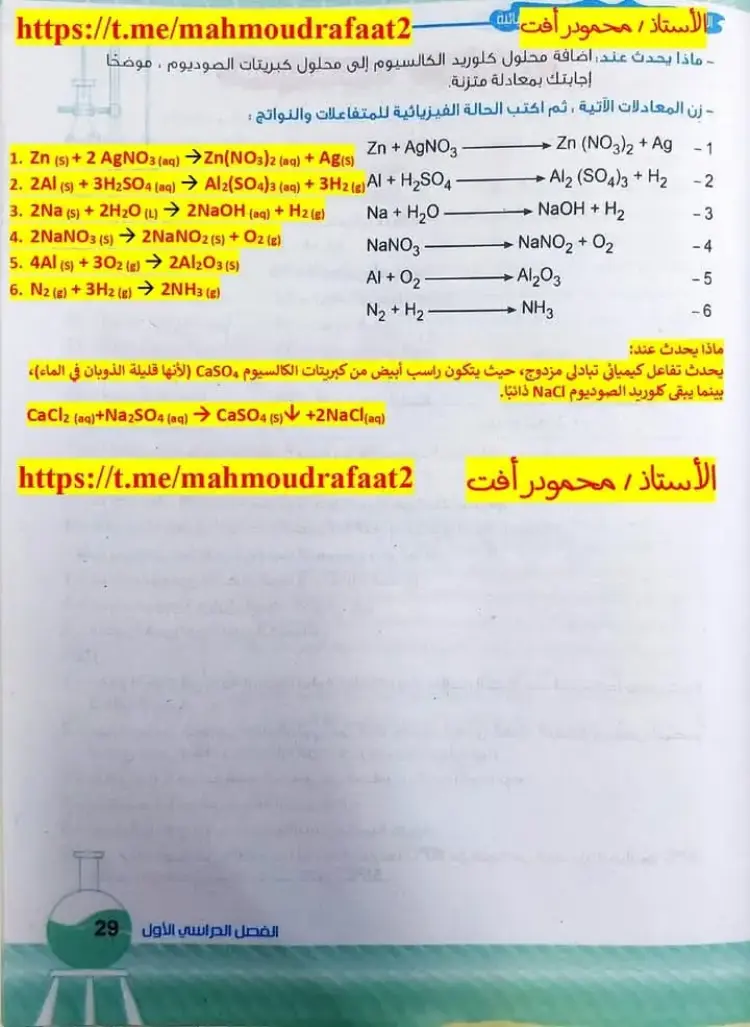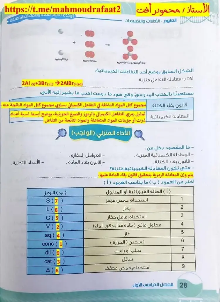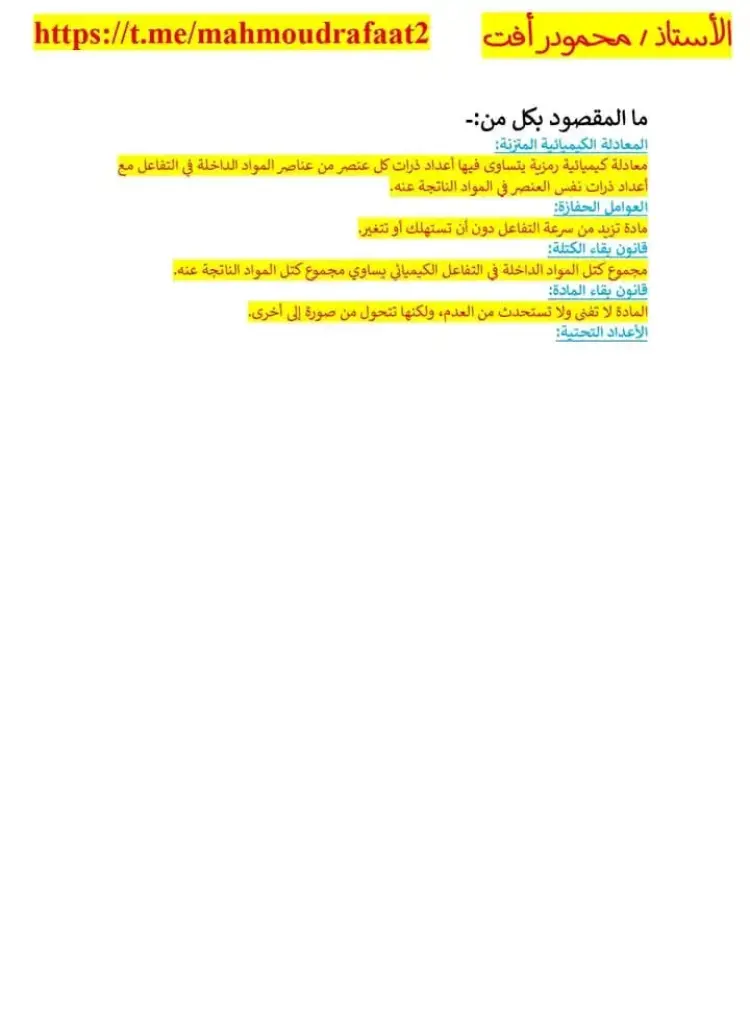 الإجابة: معادلة كيميائية رمزية يتساوى فيها أعداد ذرات كل عنصر من عناصر المواد الداخلة في التفاعل مع أعداد ذرات نفس العنصر في المواد الناتجة عنه.