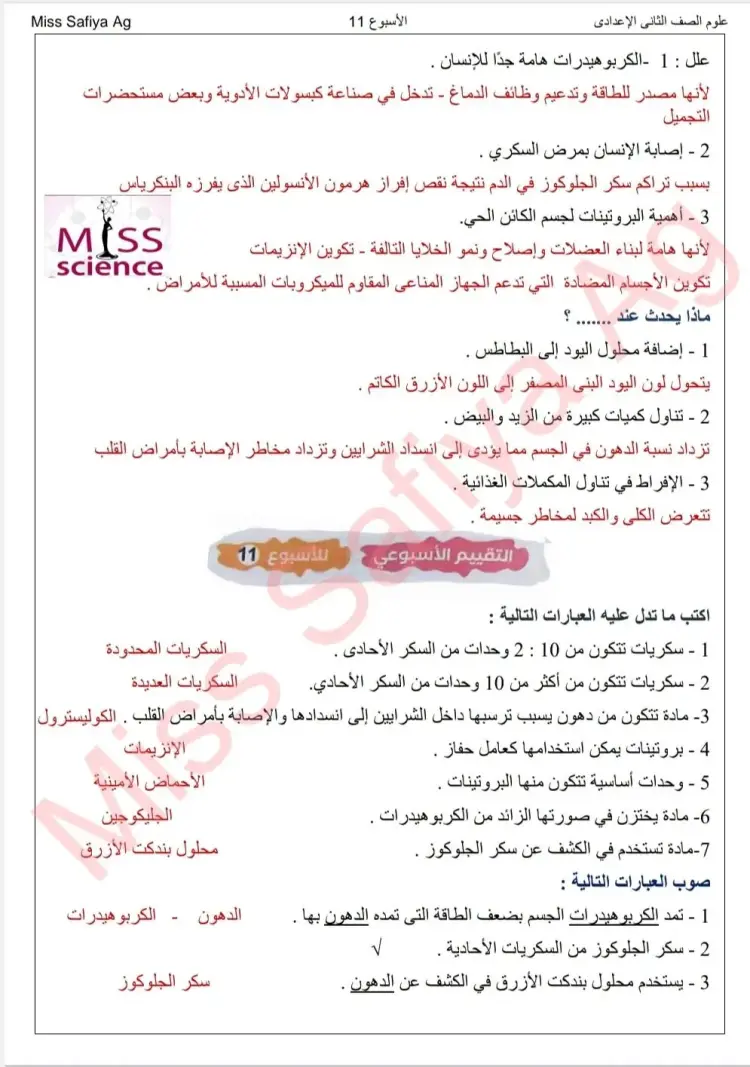 حل التقييم الأسبوعي علوم ثانية إعدادي الأسبوع الحادي عشر ترم أول 2026