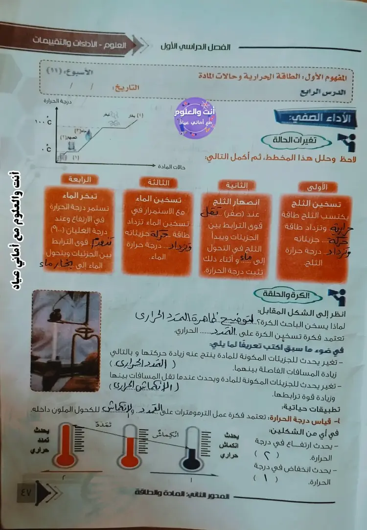 • السؤال: اكتب ما تدل عليه العبارة التالية: "يؤدي لزيادة حجم المادة نتيجة ارتفاع درجة الحرارة".