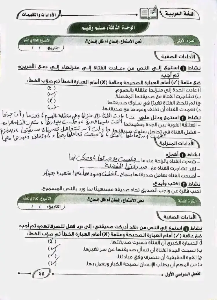 يستمر طلاب الصف الثاني الإعدادي في متابعة حل الأداء الصفي وواجب وتقييم الأسبوع الحادي عشر عربي للصف الثاني الإعدادي ترم أول 2026 بهدف الوصول إلى الإجابات التي يعتمد عليها المعلمون عند توضيح محتوى ملف الأداءات والتقييمات الصادر عن وزارة التربية والتعليم والتعليم الفني.