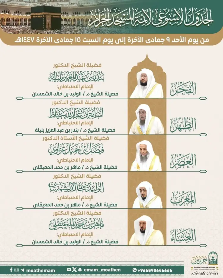 جدول أئمة الحرم المكي هذا الأسبوع من 9 إلى 15 جمادى الآخرة 1447 وقائمة المؤذنين