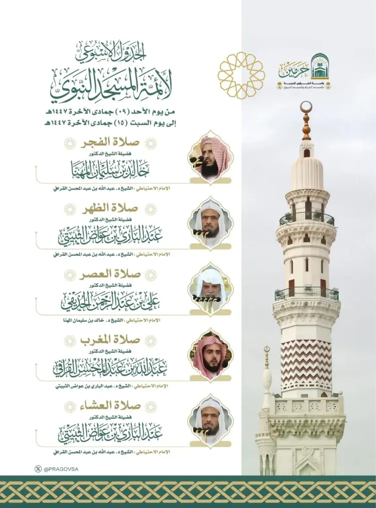 جدول أئمة المسجد النبوي هذا الأسبوع 1447